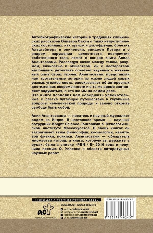 Автобиографические истории в традициях клинических рассказов Оливера Сакса о таких нейротипических состояниях, как аутизм и шизофрения, болезнь Альцгеймера и эпилепсия, синдром Котара и cиндром нарушения целостности восприятия собственного тела, лежат в основе книги Анила Анантасвами, индийского научного журналиста и ученого. Расследуя связи между телом, разумом, личностью и обществом, он с мастерством настоящего детектива сочетает научный и жизненный опыт своих героев. Анантасвами, представляя нам трогательные истории из жизни людей из самых разных уголков света, рассказывает об интересных достижениях современности и в то же время заставляет задуматься, а кто же мы на самом деле.