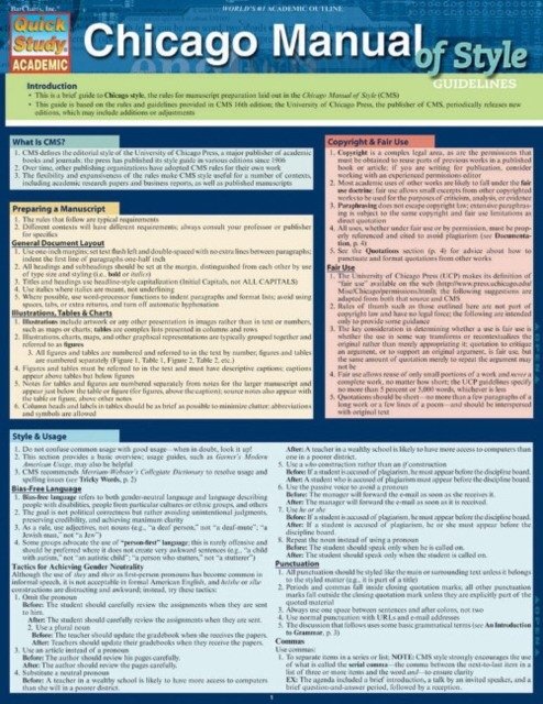 When that research paper comes due and you've forgotten your style manual, get the guidance you need quickly with the Chicago Manual of Style QuickStudy(R) guide. Based on the 16th edition of CMS, this handy, easy-to-carry three-panel guide contains the information you need for writing academic papers to CMS specifications, pared down to the essentials, including common, real-world sample references for both CMS citation formats so that you can be sure you are giving appropriate credit where credit is due.
