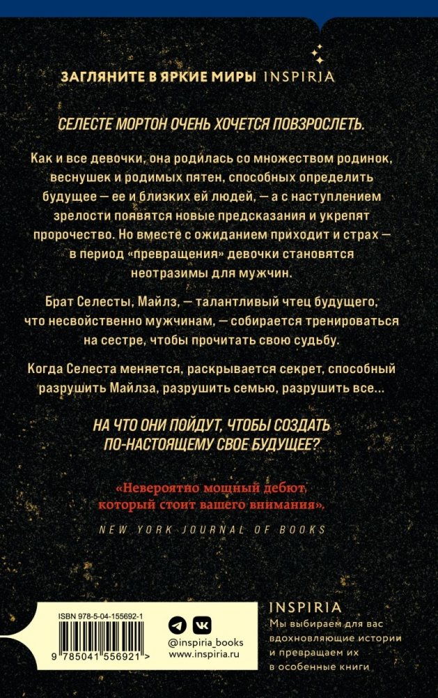 Селесте Мортон очень хочется повзрослеть. Как и все девочки, она родилась со множеством родинок, веснушек и родимых пятен, способных определить будущее: ее и близких ей людей, — а с наступлением зрелости появятся новые предсказания и укрепят пророчество. Но вместе с ожиданием приходит и страх — в период "превращения" девочки становятся неотразимы для мужчин.