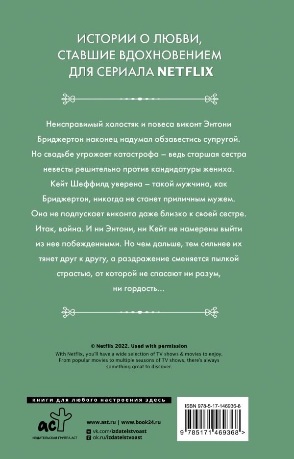 Неисправимый холостяк и повеса виконт Энтони Бриджертон наконец надумал обзавестись супругой. Но свадьбе угрожает катастрофа – ведь старшая сестра невесты решительно против кандидатуры жениха. Кейт Шеффилд уверена – такой мужчина, как Бриджертон, никогда не станет приличным мужем. Она не подпускает виконта даже близко к своей сестре. Итак, война. И ни Энтони, ни Кейт не намерены выйти из нее побежденными. Но чем дальше, тем сильнее их тянет друг к другу, а раздражение сменяется пылкой страстью, от которой не спасают ни разум, ни гордость...