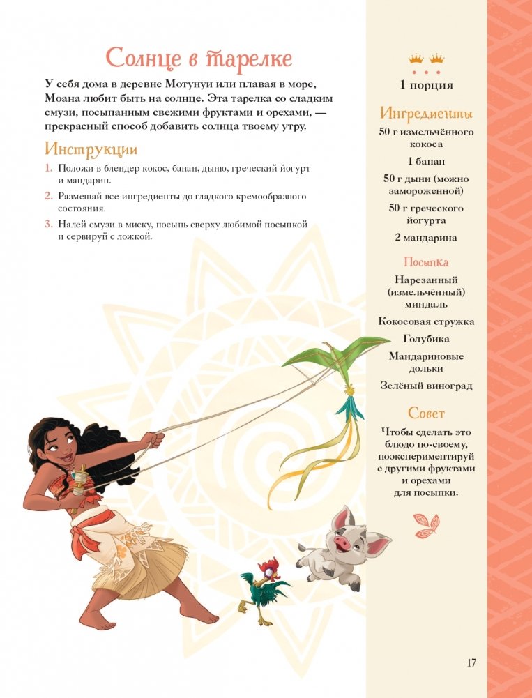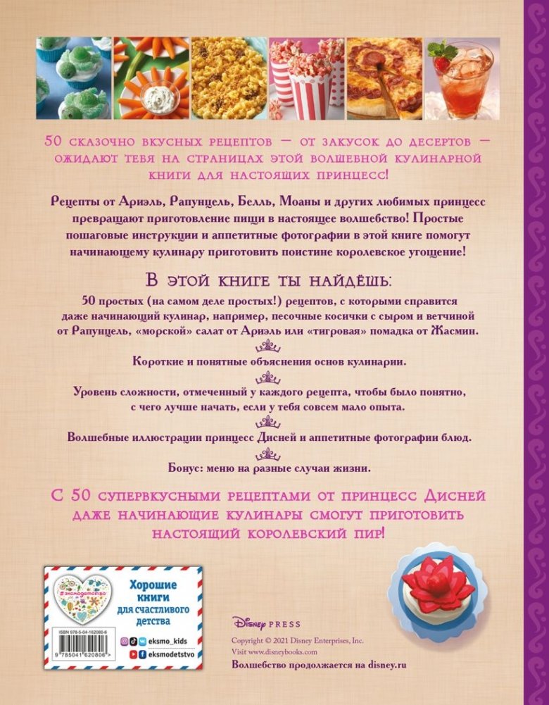 • 50 простых (на самом деле простых!) рецептов, с которыми справится даже начинающий кулинар, например, песочные косички с сыром и ветчиной от Рапунцель, «морской» салат от Ариэль или «тигровая» помадка от Жасмин.