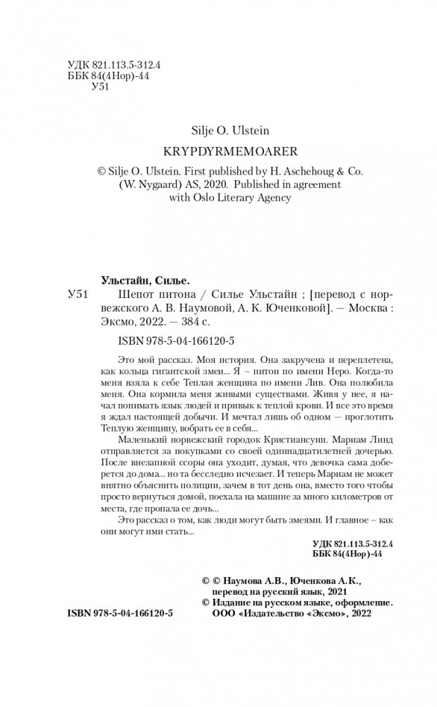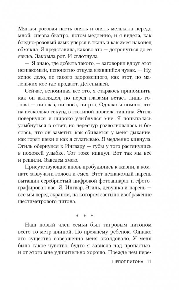 Это мой рассказ. Моя история. Она закручена и переплетена, как кольца гигантской змеи… Я – питон по имени Неро. Когда-то меня взяла к себе Теплая женщина по имени Лив. Она полюбила меня. Она кормила меня живыми существами. Живя у нее, я начал понимать язык людей и привык к теплой крови. И все это время я ждал настоящей добычи. И мечтал лишь об одном – проглотить Теплую женщину, вобрать ее в себя…