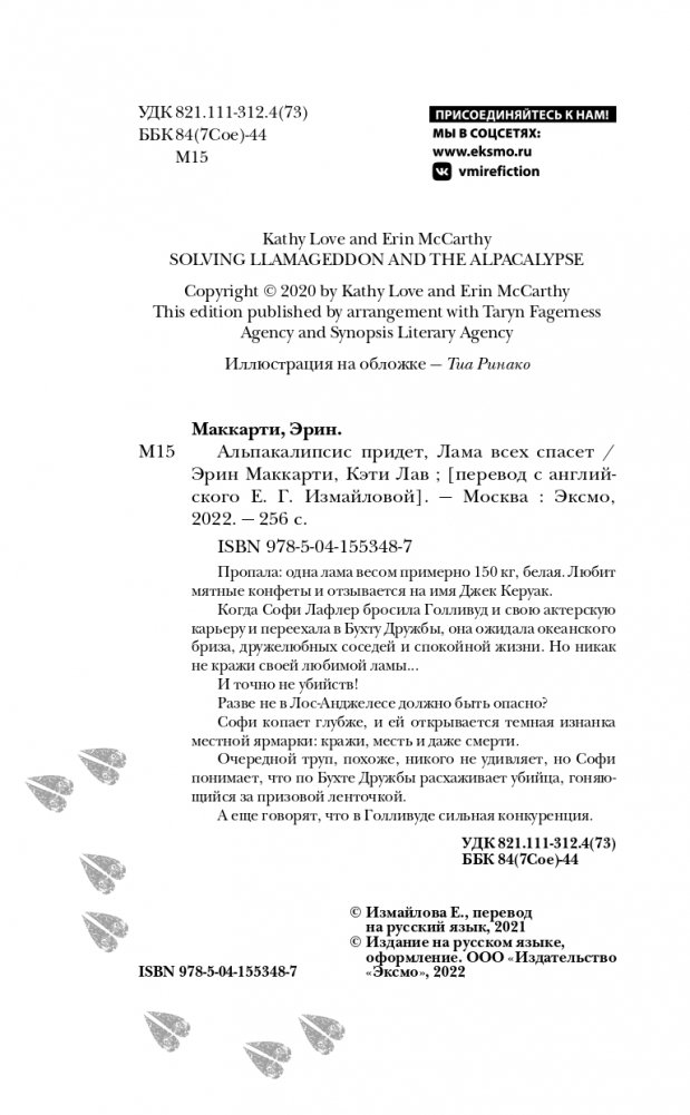 Удивительно уютный детектив от дуэта прекрасных авторов — Кэти Лав и Эрин Маккарти. Причудливые персонажи, забавные ситуации и хорошие шутки — то, что надо для приятного вечера в компании с книгой. Закрученное расследование не даст заскучать, а парирования главных героев и ворчливая лама по имени Джек Керуак заставят улыбаться с первой страницы и до последней.