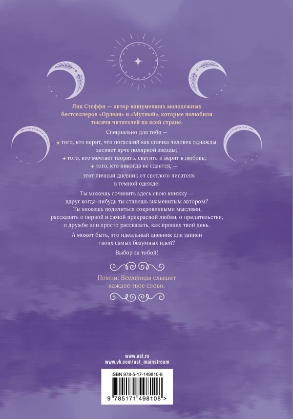Творческий дневничок для записей от Лии Стеффи - автора нашумевших молодежных бестселлеров «Орлеан» и «Мутный». В нем можно: - поставить творческие цели; - написать свою книгу; - делиться сокровенными мыслями; - вести повседневные записи; - записывать самые безумные идеи. Бонусы: - список для книг, которые ты хочешь прочитать; - список для фильмов, которые ты хочешь посмотреть; - мотивирующие цитаты из книг Лии Стеффи.