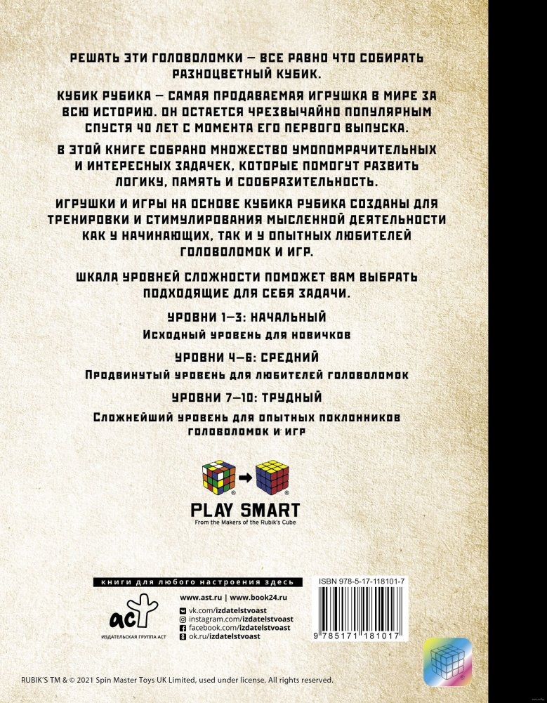 Кубик Рубика — самая продаваемая игрушка в мире за всю историю. Он остается чрезвычайно популярным спустя более 40 лет с момента его первого выпуска. В книге собрано множество умопомрачительных и интересных задачек, которые помогут развить логику, память и сообразительность. Оригинальные головоломки разного уровня сложности — от начального до продвинутого.