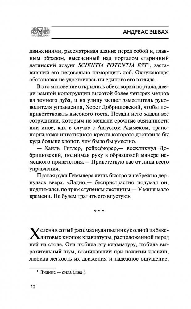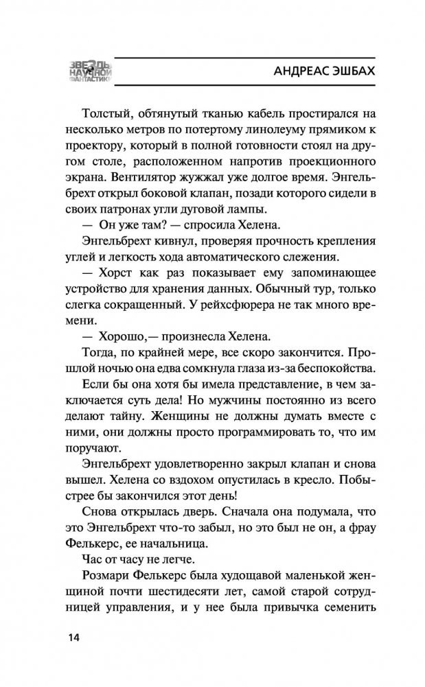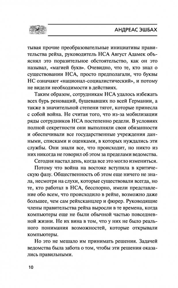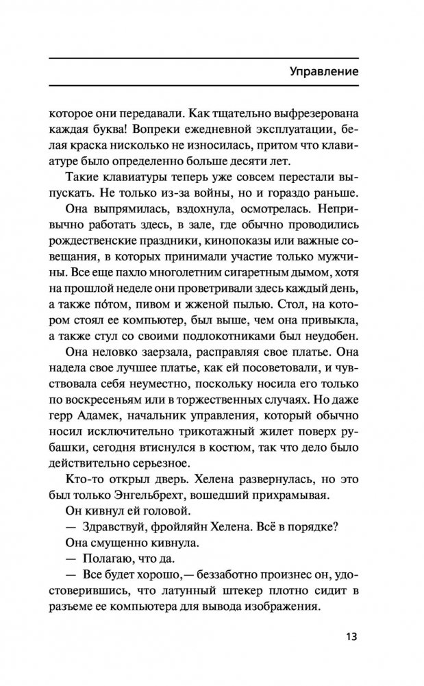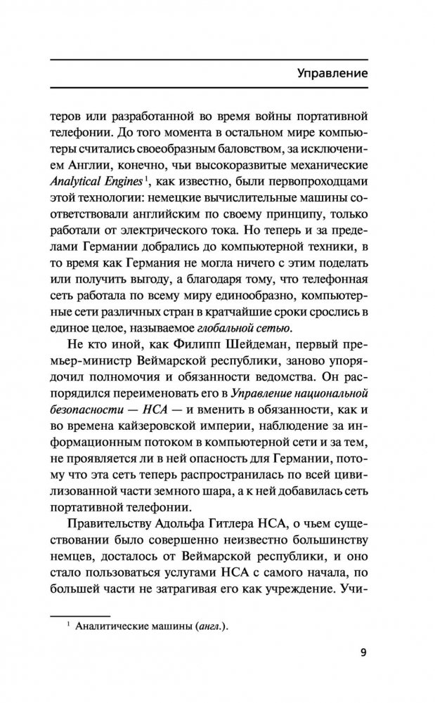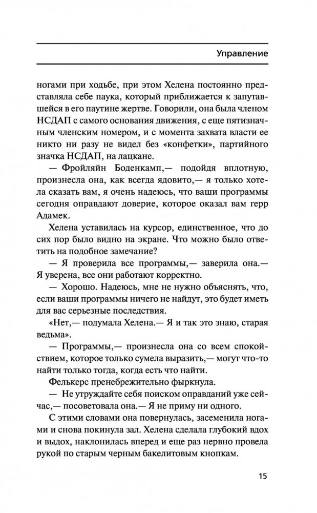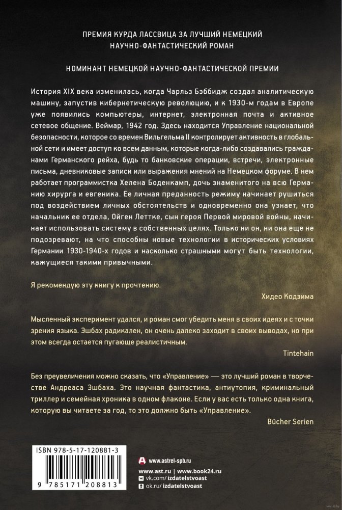 История XIX века изменилась, когда Чарльз Бэббидж создал аналитическую машину, запустив кибернетическую революцию, и к 1930‑м годам в Европе уже появились компьютеры, интернет, электронная почта и активное сетевое общение. Веймар, 1942 год. Здесь находится Управление национальной безопасности, которое со времен Вильгельма II контролирует активность в глобальной сети и имеет доступ ко всем данным, которые когда‑либо создавались гражданами Германского рейха, будь то банковские операции, встречи, электронные письма, дневниковые записи или выражения мнений на Немецком форуме. В нем работает программистка Хелена Боденкамп, дочь знаменитого на всю Германию хирурга и евгеника. Ее личная преданность режиму начинает рушиться под воздействием личных обстоятельств и одновременно она узнает, что начальник ее отдела, Ойген Леттке, сын героя Первой мировой войны, начинает использовать систему в собственных целях. Только ни он, ни она еще не подозревают, на что способны новые технологии в исторических условиях Германии 1930–1940‑х годов и насколько страшными могут быть технологии, кажущиеся такими привычными.