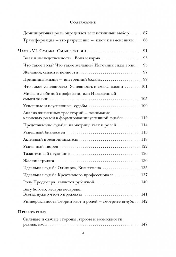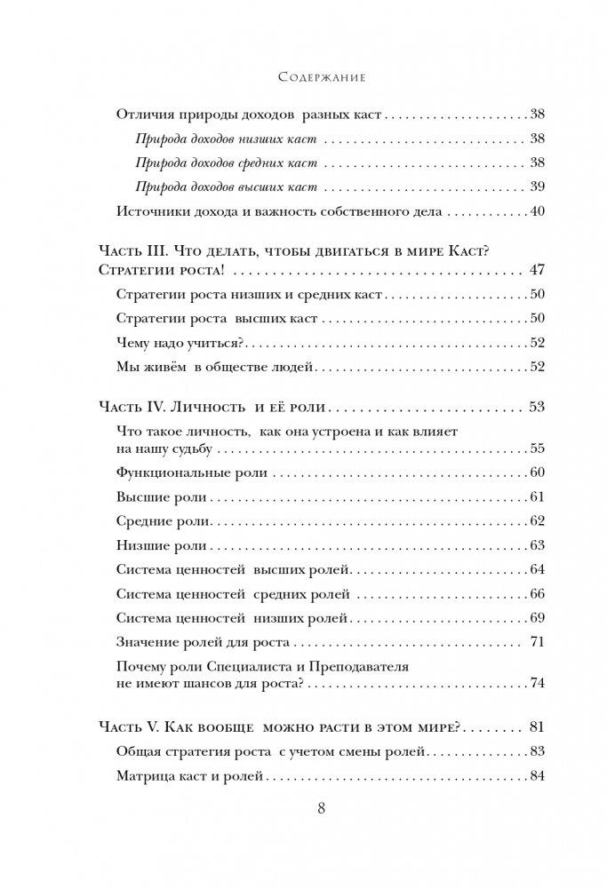 Революционная книга, которая еще до публикации получила десятки тысяч приверженцев. Автор описывает касты современного общества: чиновники, жандармы, рабы, профессионалы, топ-менеджеры, олигархи, бизнесмены, властители, жрецы и др. Чем выше каста — тем большими свободами и возможностями обладают ее члены. Переход из касты в касту определяют роли, которые играет человек на жизненном пути.