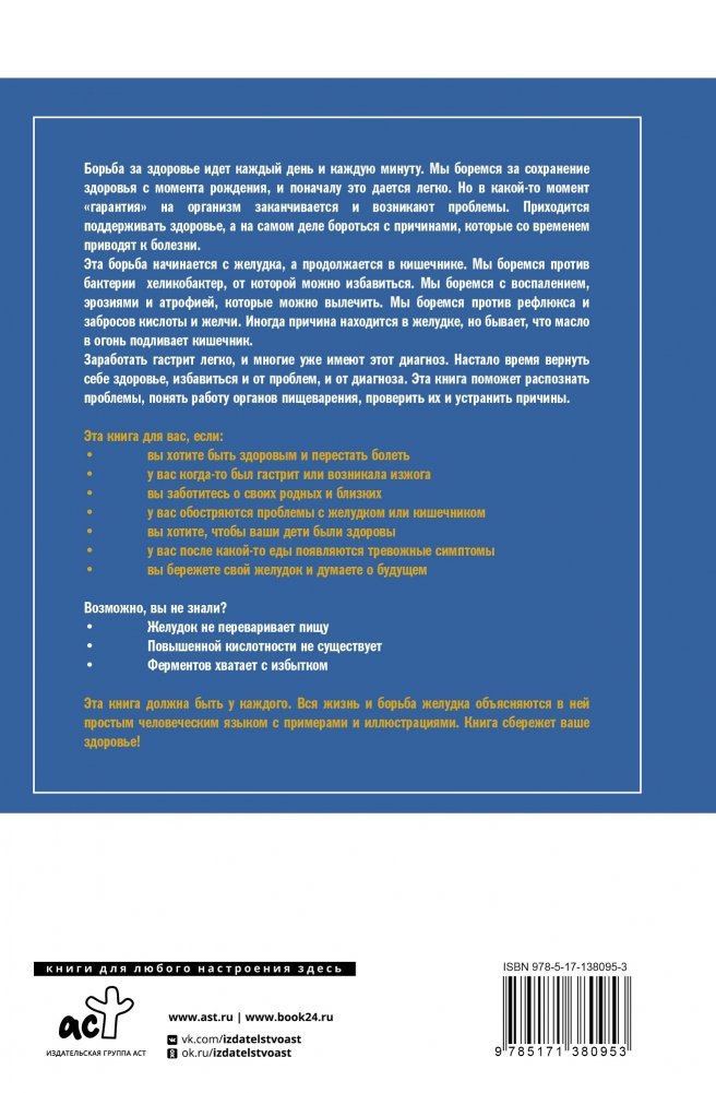 Эта книга написана для простых людей, либо страдающих от заболеваний желудочно‑кишечного тракта, либо желающих избежать их в будущем, либо стремящихся помочь близким. Первая часть книги посвящена верхней части пищеварительной системы, ведь начало — это самое главное. Мы разберемся с проблемами пищевода, желудка, поджелудочной железы, печени, желчного пузыря, неправильная работа которых вызывает боли, тяжесть или изжогу. Вторая часть книги посвящена кишечнику, который один составляет больше половины всей пищеварительной системы. Мы развеем мифы в отношении кишечника, научимся правильно понимать его симптомы и сигналы, разберемся, как следить за кишечником, как уменьшить его раздражение и погасить происходящий в нем бактериальный бунт.