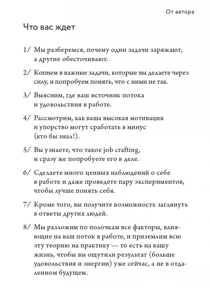 С книгой вы сделаете много ценных наблюдений о себе в работе. Проведете несколько экспериментов, чтобы лучше понять себя. Найдете такой режим, в котором сможете получать удовольствие от работы в реальной жизни, здесь и сейчас.