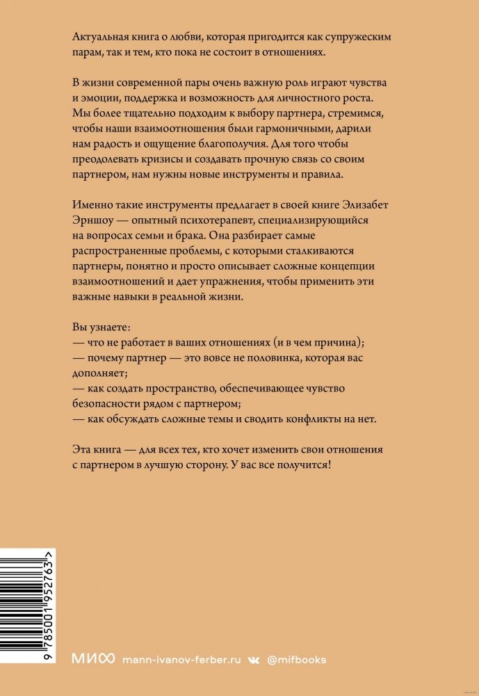 Именно такие инструменты предлагает Элизабет Эрншоу, психотерапевт, специализирующийся на вопросах семьи и брака. Она разбирает самые распространенные проблемы, с которыми сталкиваются партнеры, понятно и просто описывает сложные концепции взаимоотношений и дает упражнения, чтобы применить эти навыки в реальной жизни.