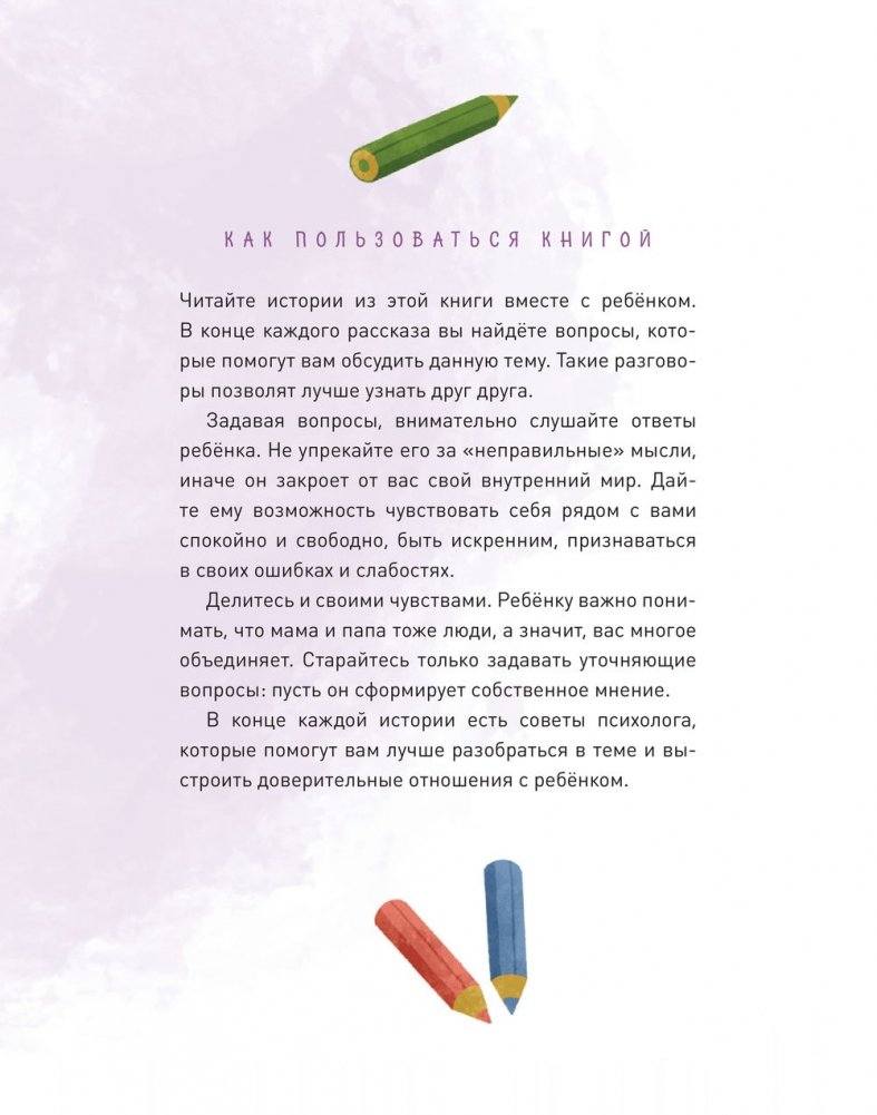 10 историй из жизни двух детей — Миры и Гоши — сопровождаются комментариями психологов и списком вопросов. Эти вопросы помогут обсудить проблемы обмана, воровства, дружбы, гендерных игр — тем, с которыми сталкивается каждая семья.
