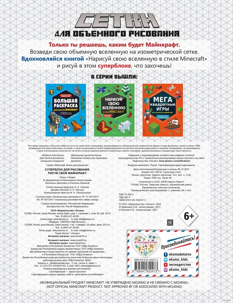 Для всех фанатов Minecraft выпустили долгожданный блок для рисования любимых персонажей, локаций, животных и злодеев. Благодаря страницам с изометрической сеткой теперь вы без труда сможете воссоздавать вселенную в объемном формате. Это блок для всех тех, кто неравнодушен к игре, кто хочет вывести в реал любимых героев, кто любит придумывать необычные сценки в мире компьютерной игры. Реализуйте свои фантазии — создавайте сценки, раскрашивайте в этом уникальном альбоме для рисования!