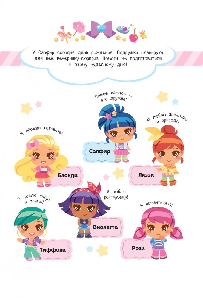 Познакомься с модными подружками и устрой незабываемую вечеринку-сюрприз в честь дня рождения Сапфир — составь приглашения, подбери угощения, укрась все вокруг, а главное, отвлекай именинницу, пока готовится праздник, — скучно в этот день не будет! Ищи отличия, проходи лабиринты, рисуй, раскрашивай, фантазируй — внутри больше двадцати веселых игр с весёлыми девчонками! Проведи время с настоящими модницами, красавицами и умницами — Тиффани, Рози, Лиззи, Виолетта, Сапфир и Блонди будут очень рады твоей компании. Окунись в мир дружбы, красоты и увлекательных головоломок, а главное, укрась все вокруг яркими, фантастически милыми наклейками!