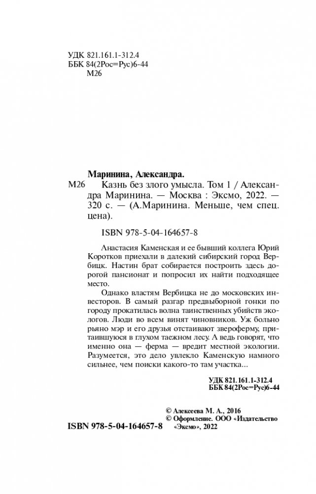 Однако, властям Вербицка не до московских инвесторов. В самый разгар предвыборной гонки по городу прокатилась волна таинственных убийств экологов. Люди во всем винят чиновников. Уж больно рьяно мэр и его друзья отстаивают звероферму, притаившуюся в глухом таежном лесу. А ведь говорят, что именно она — ферма — вредит местной экологии. Разумеется, это дело увлекло Каменскую намного сильнее, чем поиски какого-то там участка…