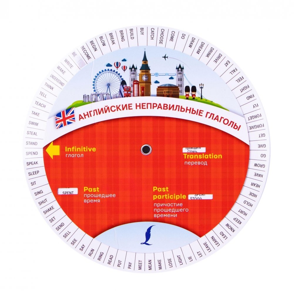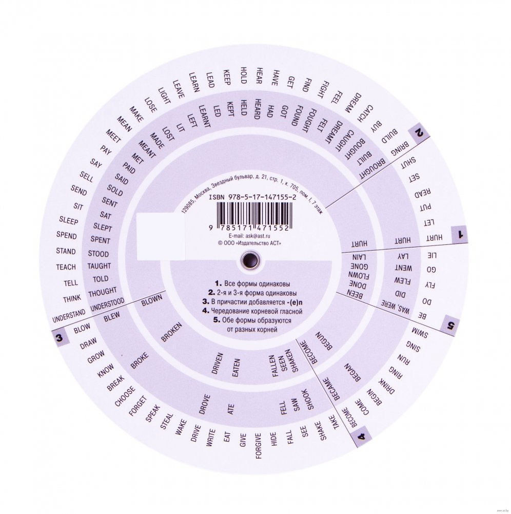 Диск-вертушка с неправильными глаголами отлично подойдет всем, кто изучает английский язык. В таблице помещены глаголы в трех формах с переводом. На обороте эти же глаголы объединены в группы со схожим способом образования. Наглядная подача материала позволит легко и быстро выучить формы неправильных английских глаголов.