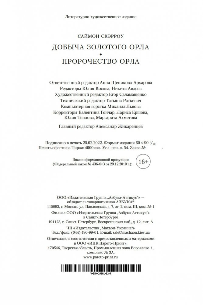 Вошедшие в сборник романы Саймона Скэрроу «Добыча золотого орла» и «Пророчество орла» продолжают знаменитый цикл «Орлы Империи», который посвящен римским легионерам и книги из которого стали бестселлерами во многих странах мира.