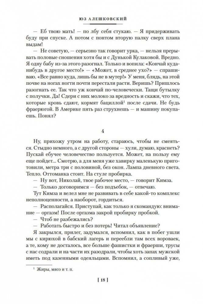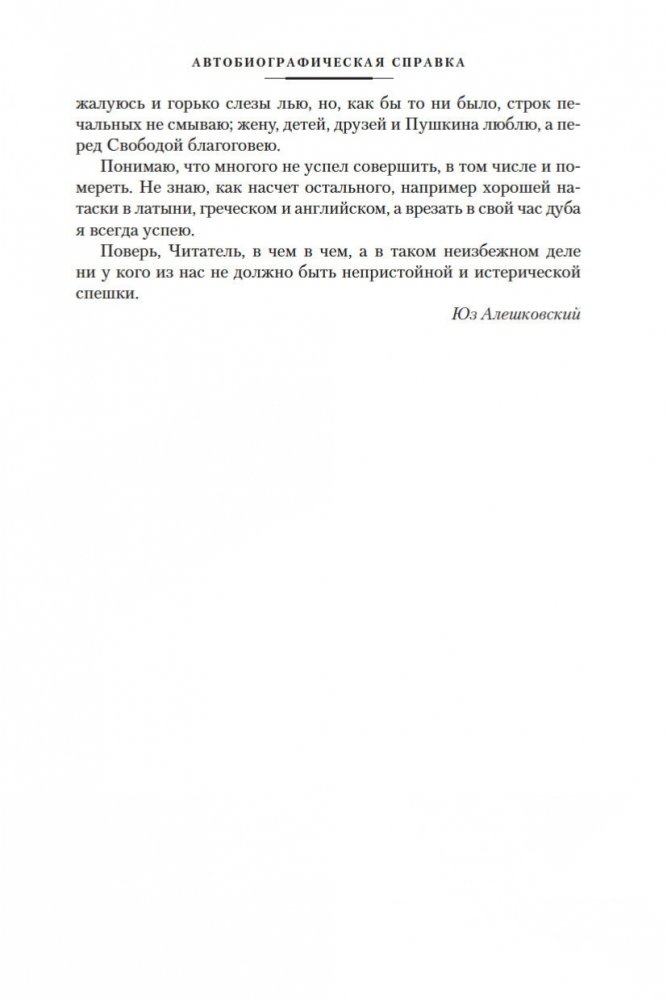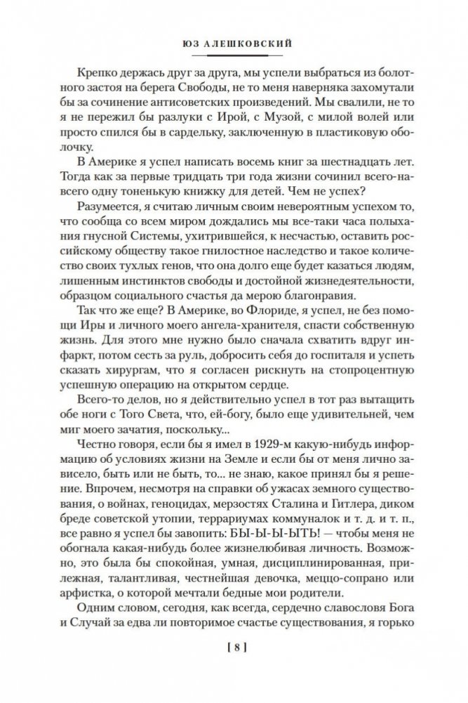 Юз Алешковский (1929–2022) — русский писатель и поэт, автор популярных «лагерных» песен, которые не исполнялись на советской эстраде, тем не менее обрели известность в народе, их горячо любили и пели, даже не зная имени автора. Перу Алешковского принадлежат также такие произведения, как «Николай Николаевич», «Кенгуру», «Маскировка» и др., которые тоже снискали народную любовь, хотя на родине писателя большая часть их была издана лишь годы спустя после создания. По словам Иосифа Бродского, в лице Алешковского мы имеем дело с уникальным типом писателя «как инструмента языка», в русской литературе таких примеров немного: Николай Гоголь, Андрей Платонов, Михаил Зощенко... «Сентиментальная насыщенность доведена в нем до пределов издевательских, вымысел — до фантасмагорических», писал Бродский, это «подлинный орфик: поэт, полностью подчинивший себя языку и получивший от его щедрот в награду дар откровения и гомерического хохота»