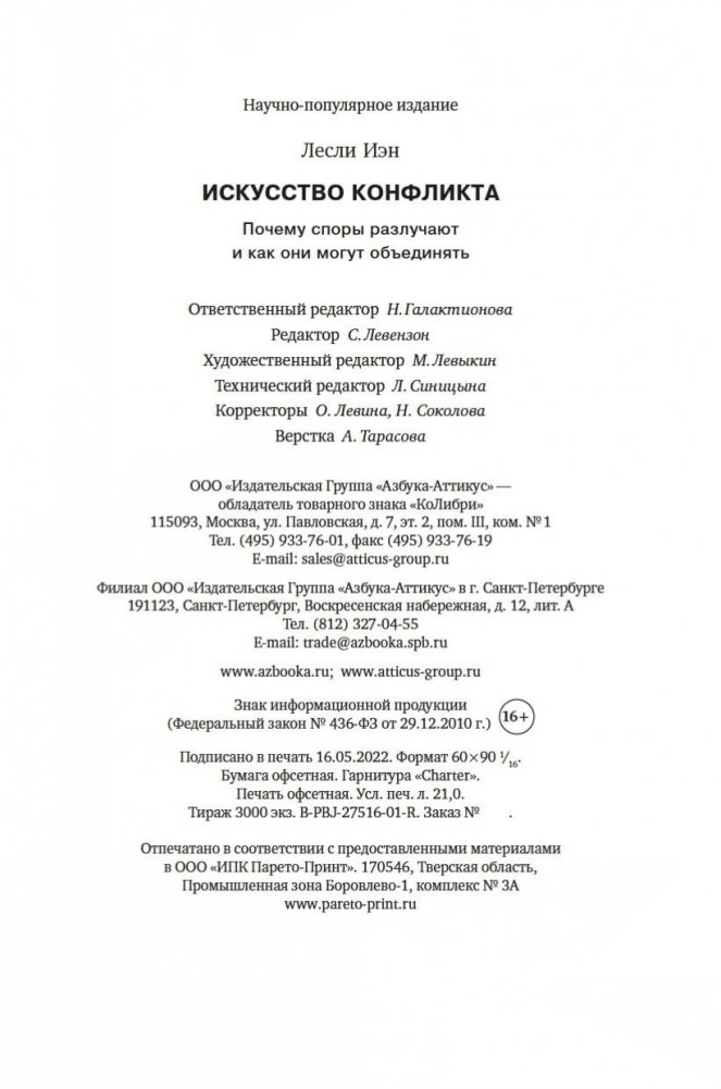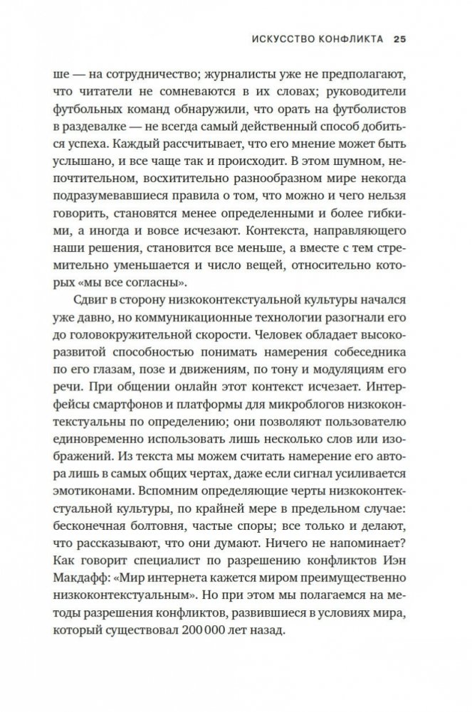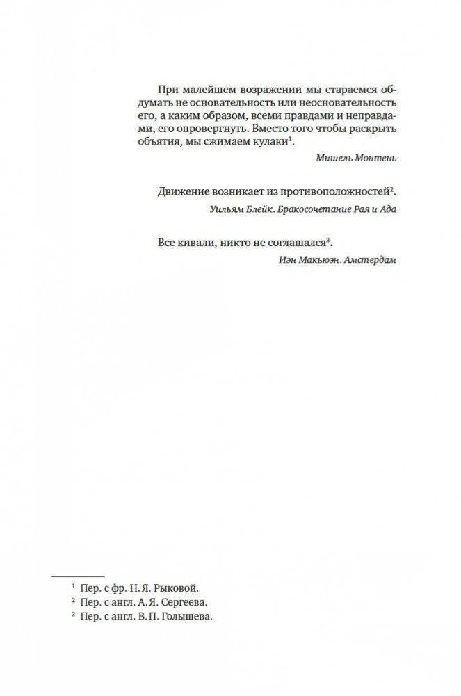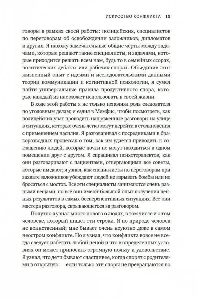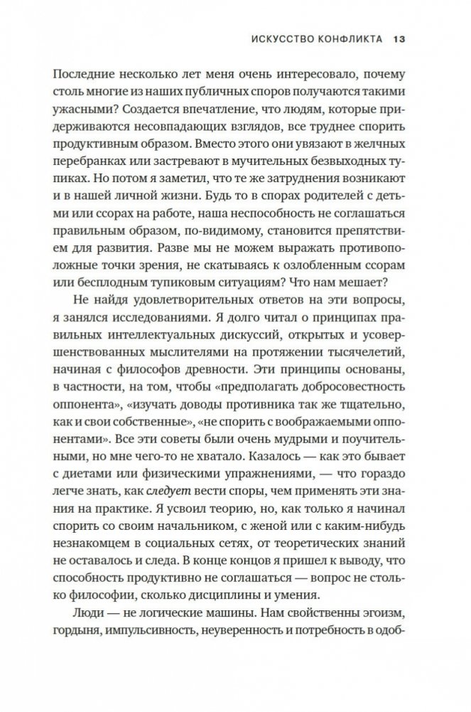 В чем секрет гармоничных отношений? Что стоит за некоторыми из величайших научных и творческих прорывов? Неожиданный ответ: конфликт. Продуктивное несогласие — это образ мышления, возможно, лучший из имеющихся. Оно развивает наш разум и творческий потенциал и даже может объединять. Оно жизненно необходимо для успеха любого совместного предприятия — от брака до коммерческой компании или демократического государства. В нашем все более склонном к конфликтам мире у нас остается единственный путь к сплочению и совместному прогрессу: учиться у тех, кто овладел искусством и наукой споров. Резюмируя опыт, полученный во взаимодействии с различными специалистами, автор этой книги предлагает набор эффективных инструментов, которые все мы можем использовать, чтобы наши диалоги были более конструктивными.