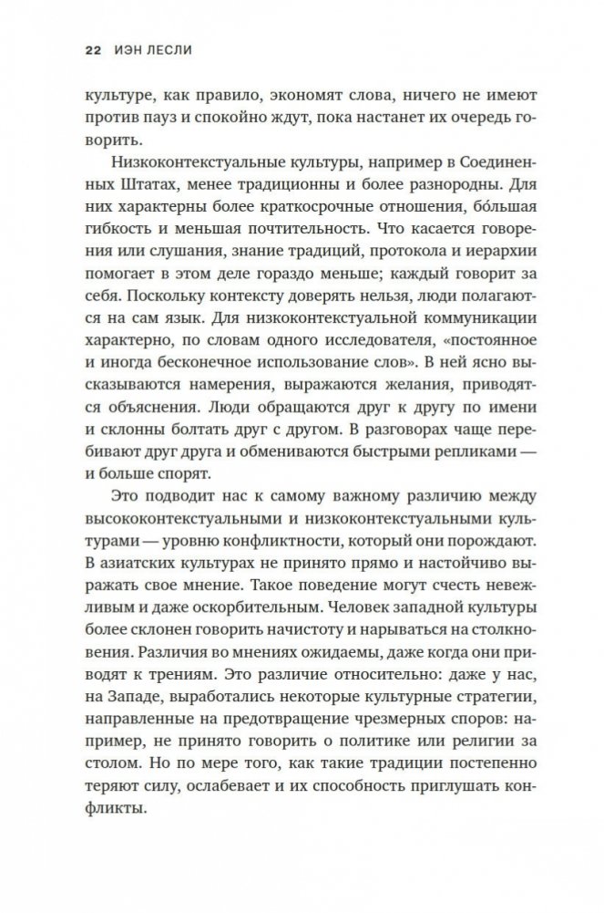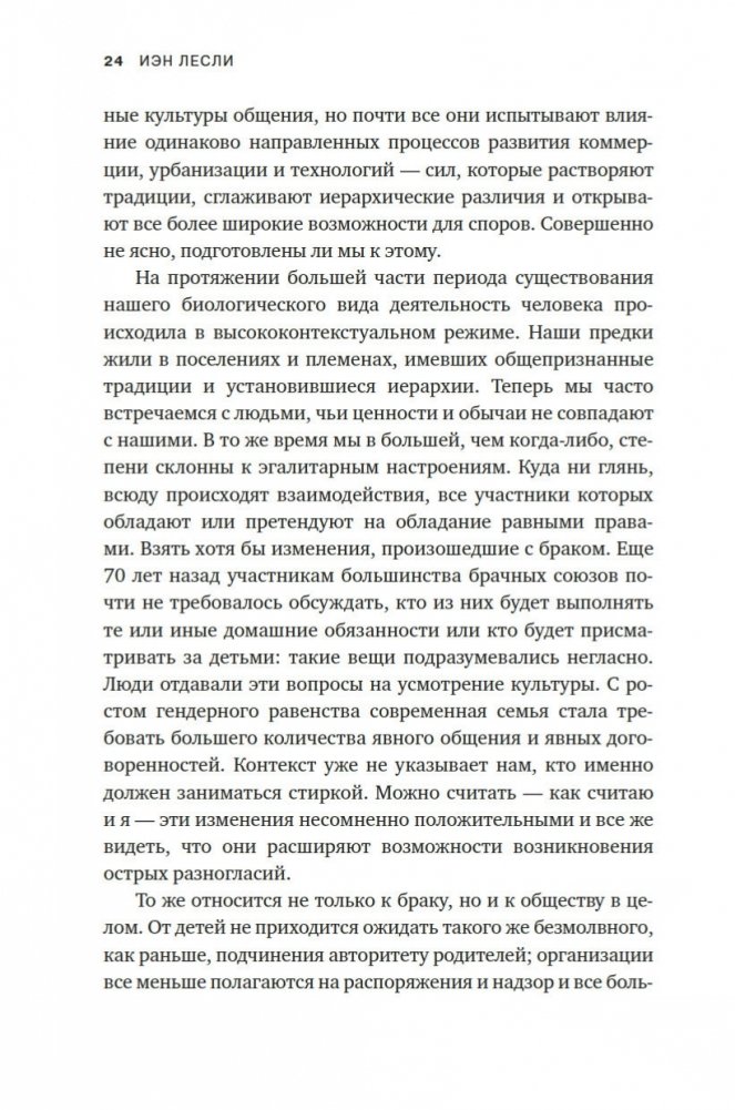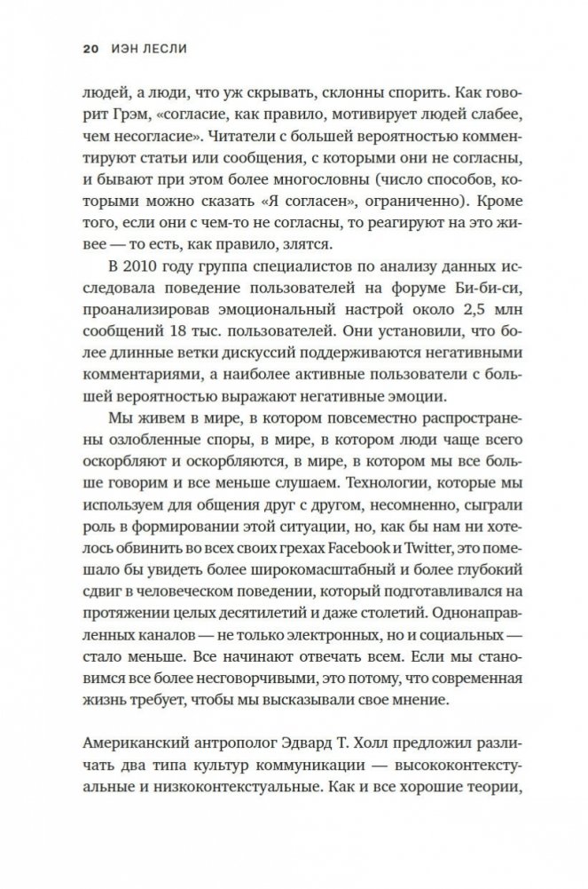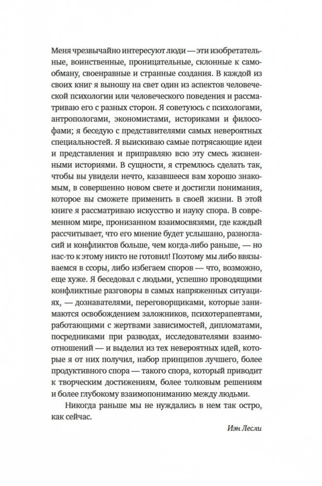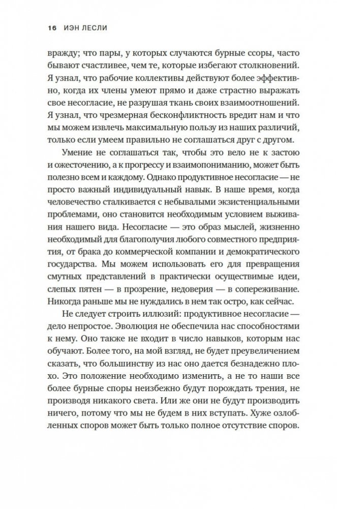 «Чтобы преодолеть трудности, которые создает несогласие, нельзя избегать его. Вместо этого нам нужно радикально изменить наши мысли о нем и отношение к нему. Люди совсем не случайно снова и снова вовлекаются в конфликты. Конфликты — абсолютно необходимая составляющая жизни, и это не преувеличение». (Иэн Лесли)