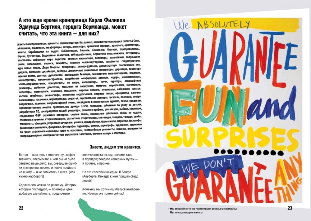 «Я говорю не о том, как принять свои промахи или научиться на них, а в следующий раз сделать лучше. Суть в том, чтобы на самом деле ошибаться намеренно. Ведь именно ошибки помогают создать нечто оригинальное — и обрести свободу, отклеиться, когда вы залипли. Сделать это можно по-разному. Истории, которые последуют, — примеры идей: добавьте случайность, предпочтите количество качеству, внесите хаос в порядок, пойдите неверным путем… Удивите себя — и вы удивите других; это бесценно в мире, в котором, кажется, уже все придумано. А еще это весело! Начнем же прямо сейчас». (Лори Розенвальд)
