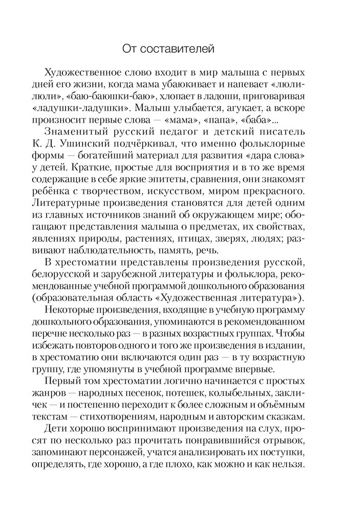 Хрестоматия включает произведения художественной литературы, рекомендованные учебной программой дошкольного образования.