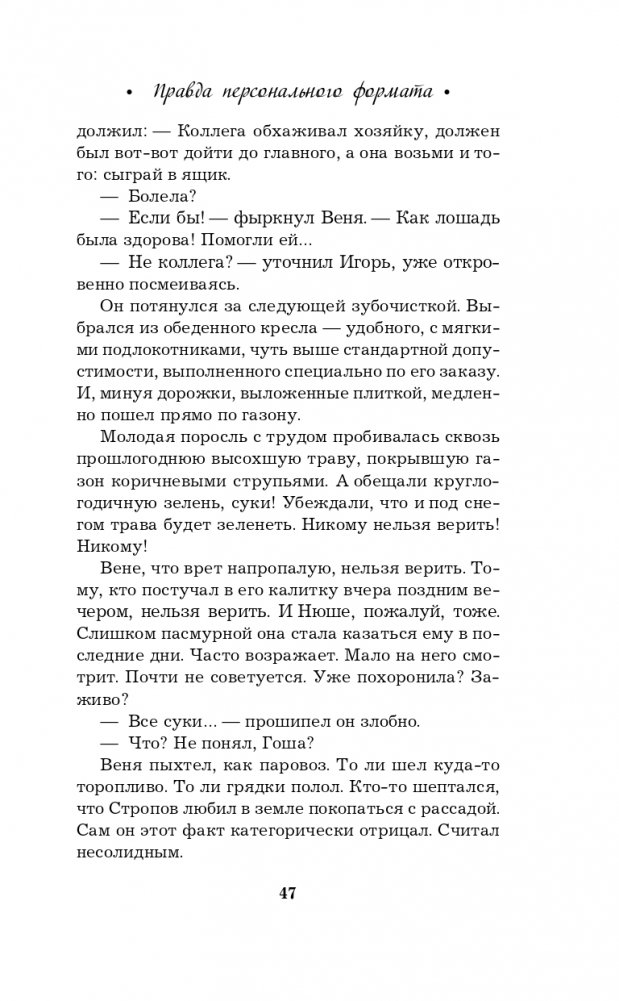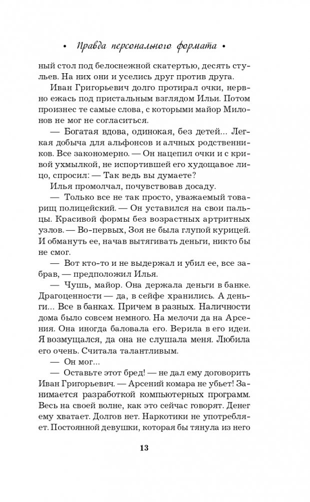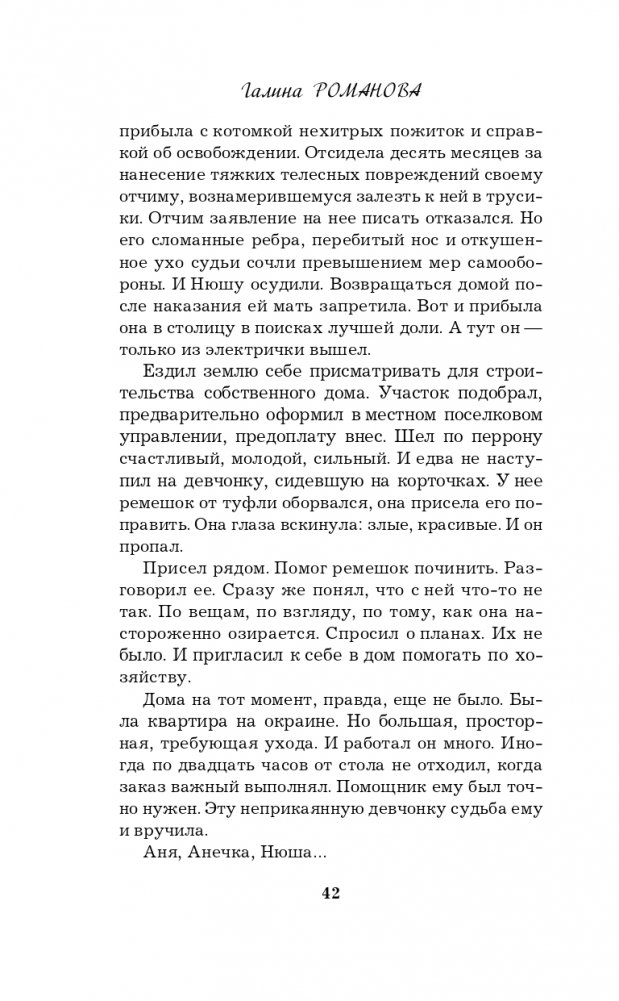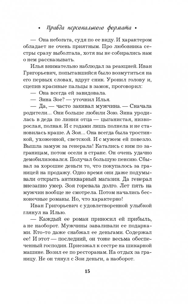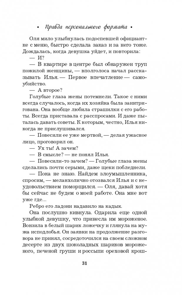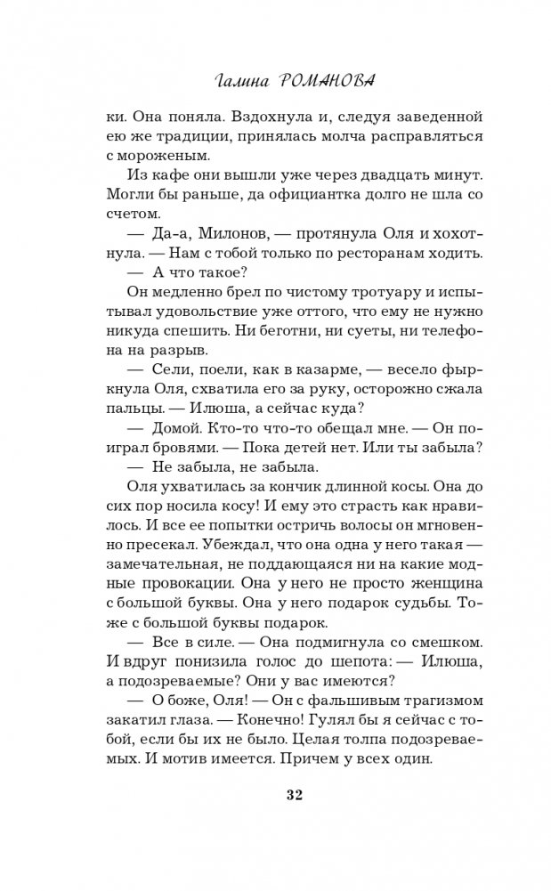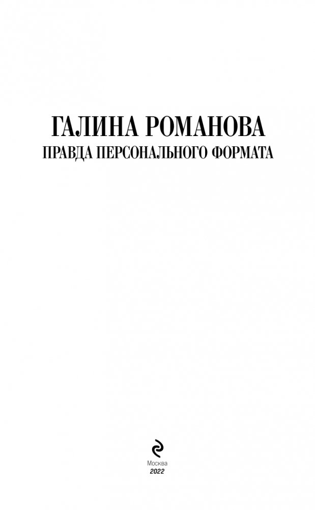 Новая книга Галины Романовой «Правда персонального формата» — очень интригующая и трогательная история о том, насколько мы ответственны за то, что делаем со своей собственной жизнью. Несколько увлекательных сюжетных линий, повествующих о судьбах разных людей, развиваются параллельно, чтобы в финале сплестись в тугой узел, когда все тайны будут раскрыты, а злодеи — выведены на чистую воду.