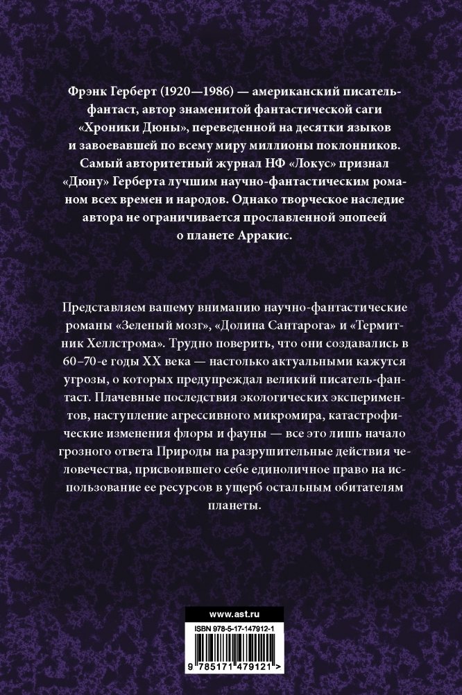 Представляем вашему вниманию научно-фантастические романы "Зеленый мозг", "Долина Сантарога" и "Термитник Хеллстрома". Трудно поверить, что они создавались в 60–70-е годы ХХ века – настолько актуальными кажутся угрозы, о которых предупреждал великий писатель-фантаст. Плачевные последствия экологических экспериментов, наступ-ление агрессивного микромира, катастрофические изменения флоры и фауны – все это лишь начало грозного ответа Природы на разрушительные действия человечества, присвоившего себе единоличное право на использование ее ресурсов в ущерб остальным обитателям планеты.