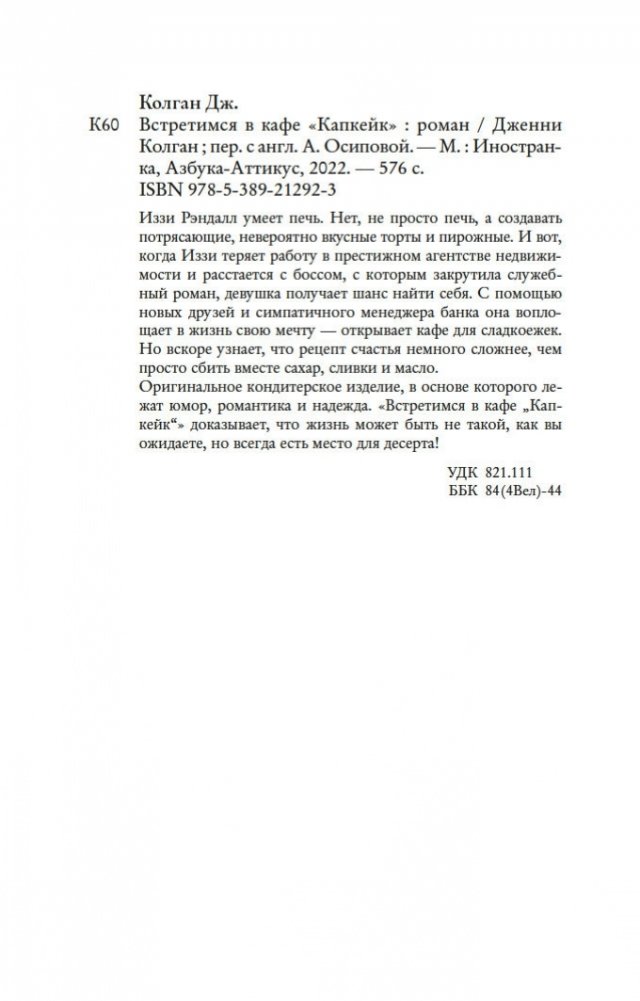 Оригинальное кондитерское изделие, в основе которого лежат юмор, романтика и надежда. «Встретимся в кафе “Капкейк”» доказывает, что жизнь может быть не такой, как вы ожидаете, но всегда есть место для десерта!