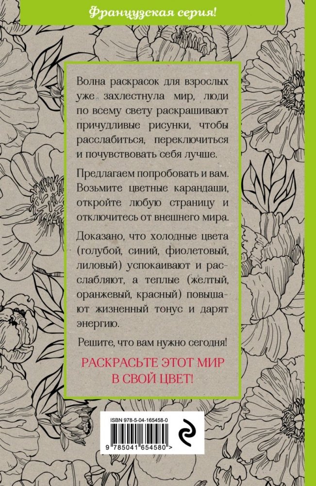 Новая серия «Арт-терапия» — это множество причудливых узоров и фантастических рисунков, которые подарят вам спокойствие и умиротворение и помогут избавиться от стресса. Возьмите цветные карандаши или ручки и полностью отключитесь от внешнего мира, раскрашивая великолепные узоры таинственного сада, и через некоторое время вы вернетесь уже полностью обновленным человеком.