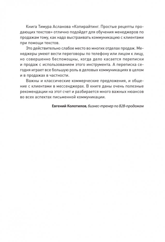 Обновленное третье издание популярной книги поможет разобраться с технологией влияния и методикой продаж в сфере письменной коммуникации, ведь именно в ней кроется большое количество проблем, которые испытывают многие компании и отделы продаж в первую очередь.