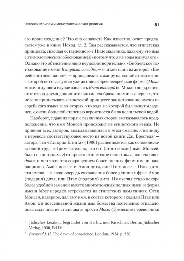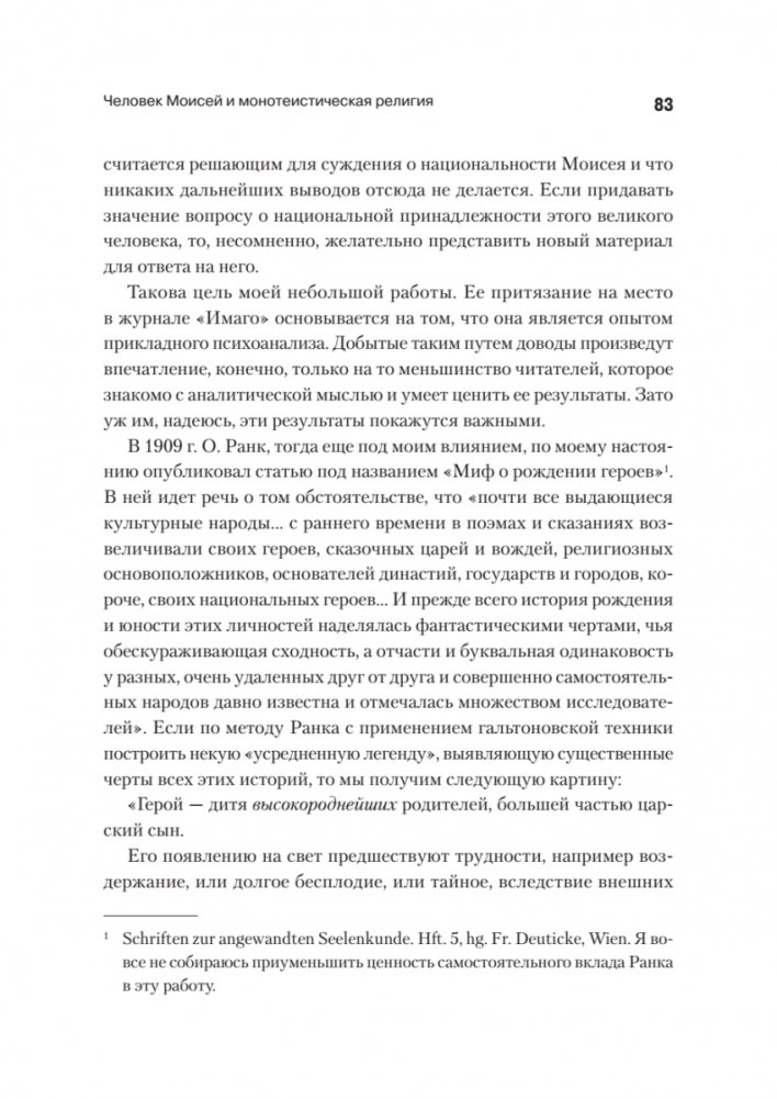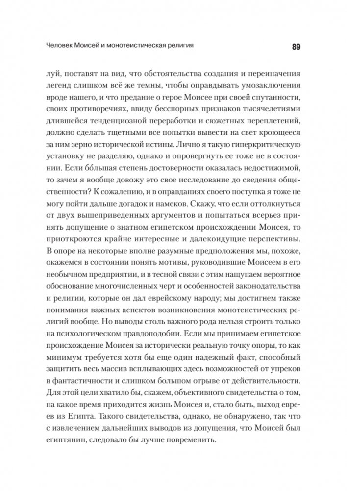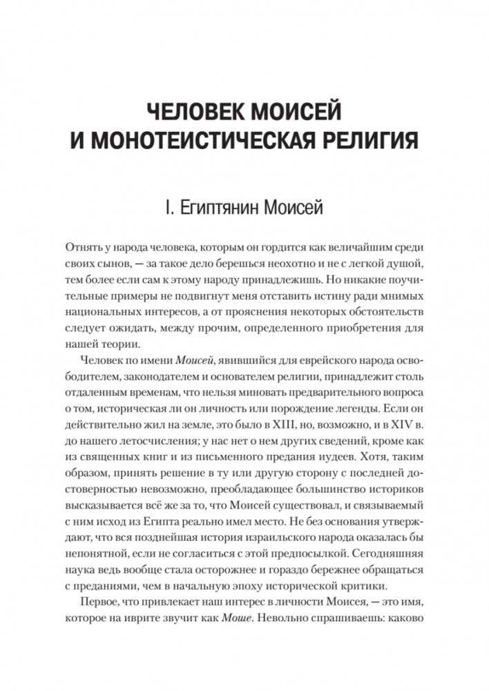 «Отнять у народа человека, которым он гордится как величайшим среди своих сынов, — за такое дело берешься неохотно и не с легкой душой, тем более если сам к этому народу принадлежишь. Но никакие поучительные примеры не подвигнут меня отставить истину ради мнимых национальных интересов», - так начинается «Человек Моисей», последняя работа великого психолога. Сочинения, включенные в эту книгу, специалисты относят к «позднему периоду», когда Фрейд совершает неожиданный поворот к теме религии. В первой работе он объявляет религию всеобщим неврозом, во второй - вглядывается в природу древнего ужаса и благоговения человека перед невыносимым божественным Отцом. Оба произведения представлены в переводе выдающегося философа и филолога В. В. Бибихина и дополнены его примечанием к последней работе Фрейда.