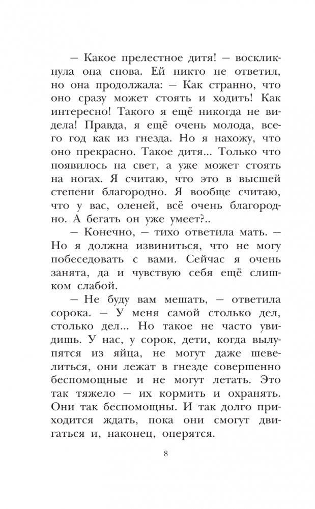 В широко известном диснеевском мультфильме "Бемби" оленёнок Бемби – очаровательный наивный малыш, который дружит со всеми обитателями леса и только иногда сталкивается с угрозой для жизни. Но в сказке австрийского писателя Феликса Зальтена всё несколько иначе. Бемби растёт в лесу, полном опасностей. С самых первых дней жизни он знает, что только ранним утром можно выходить на луг, умеет передвигаться бесшумно, учится справляться с одиночеством и распознавать уловки коварного Его. Того, кого боятся все звери. Жизнь Бемби полна тревог и страха, но в ней есть место для дружбы и для любви.