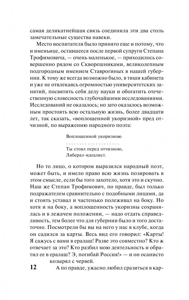 На глазах у читателей разворачивается настоящая драма: в центре повестования — группа нигилистов во главе с Петром Верховенским, планирующая поднять смуту по всей России. У главного же героя романа Николая Ставрогина — своя тайна, свой страшный грех и своя большая беда — он совершенно опустошен, и жизнь уже не представляет для него никакого интереса. События в романе проносятся вихрем перед читателем, запутываются в какой-то чудовищный клубок и в результате разрешаются трагедией.