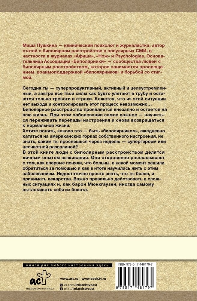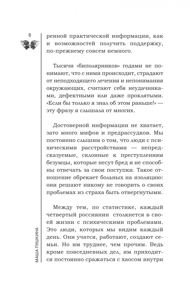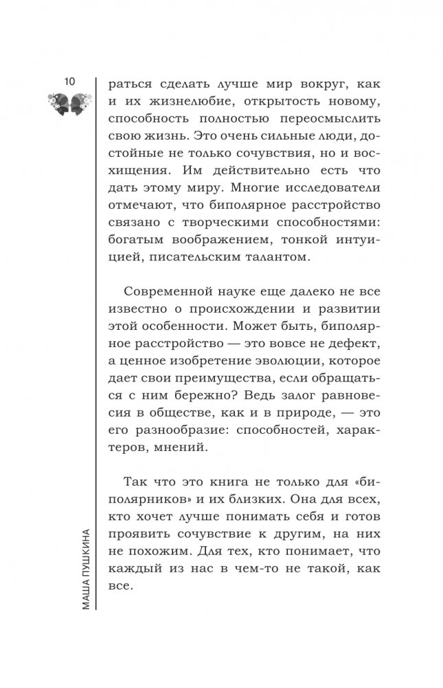 Маша Пушкина — профессиональный переводчик и автор статей о биполярном расстройстве в популярных СМИ, в частности, в журналах «Афиша», «Нож» и Psychologies. Основательница Ассоциации «Биполярники» — сообщества людей с биполярным расстройством, которое занимается просвещением, взаимоподдержкой биполярников и борьбой со стигмой.