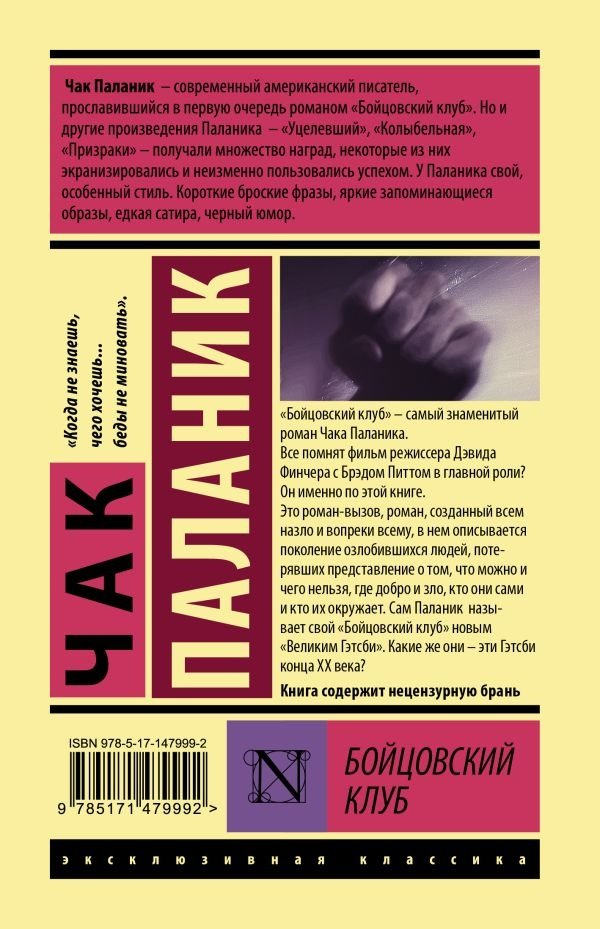 "Бойцовский клуб" – самый знаменитый роман Чака Паланика. Все помнят фильм режиссера Дэвида Финчера с Брэдом Питтом в главной роли? Он именно по этой книге. Это роман-вызов, роман, созданный всем назло и вопреки всему, в нем описывается поколение озлобившихся людей, потерявших представление о том, что можно и чего нельзя, где добро и зло, кто они сами и кто их окружает. Сам Паланик называет свой "Бойцовский клуб" новым "Великим Гэтсби". Какие же они – эти Гэтсби конца XX века?