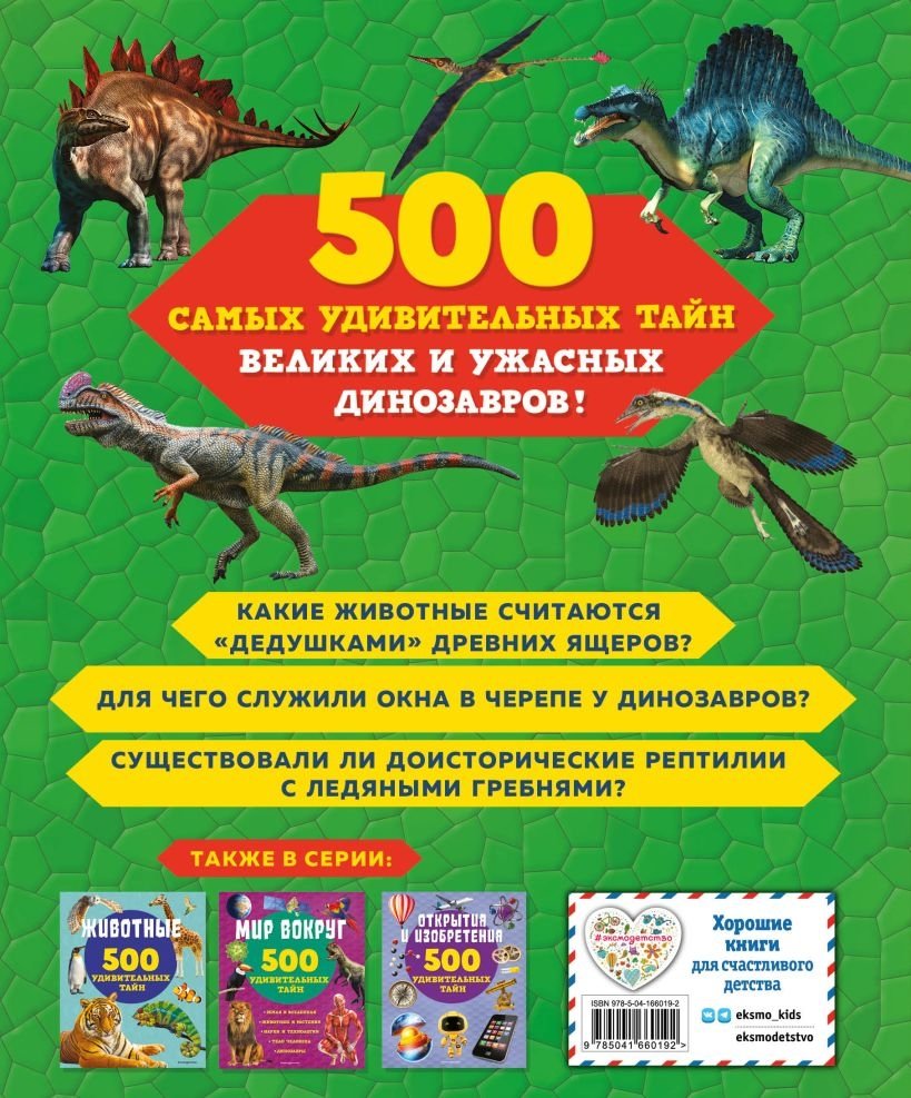 Приготовься: тебя ждёт самое невероятное приключение за 65 000 000 лет! Эта книга раскроет 500 удивительных, порой совершенно необъяснимых, а иногда даже шокирующих тайн динозавров, безраздельно царствовавших на Земле в мезозойскую эру. Ты узнаешь, каковы были истинные размеры и умственные способности древних ящеров, чем они питались, как общались друг с другом и сражались с врагами, где обитали и почему в конце концов вымерли. А затем ты вернёшься из далёких времён обратно в наши дни и вместе с бравыми палеонтологами поучаствуешь в увлекательных баталиях, то и дело разворачивающихся вокруг загадочных окаменелых останков первобытных гигантов!