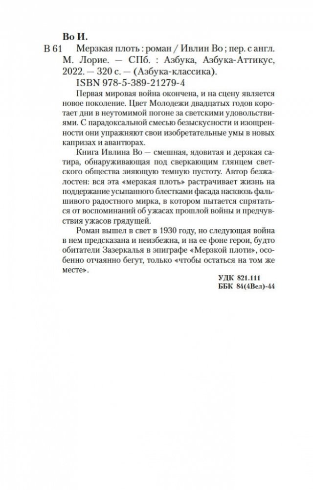 Книга Ивлина Во — смешная, ядовитая и дерзкая сатира, обнаруживающая под сверкающим глянцем светского общества зияющую темную пустоту. Автор безжалостен: вся эта «мерзкая плоть» растрачивает жизнь на поддержание усыпанного блестками фасада насквозь фальшивого радостного мирка, в котором пытается спрятаться от воспоминаний об ужасах прошлой войны и не дать просочиться предчувствию ужасов грядущей.