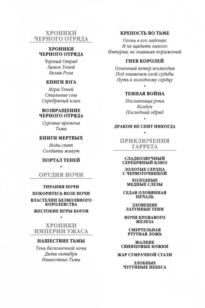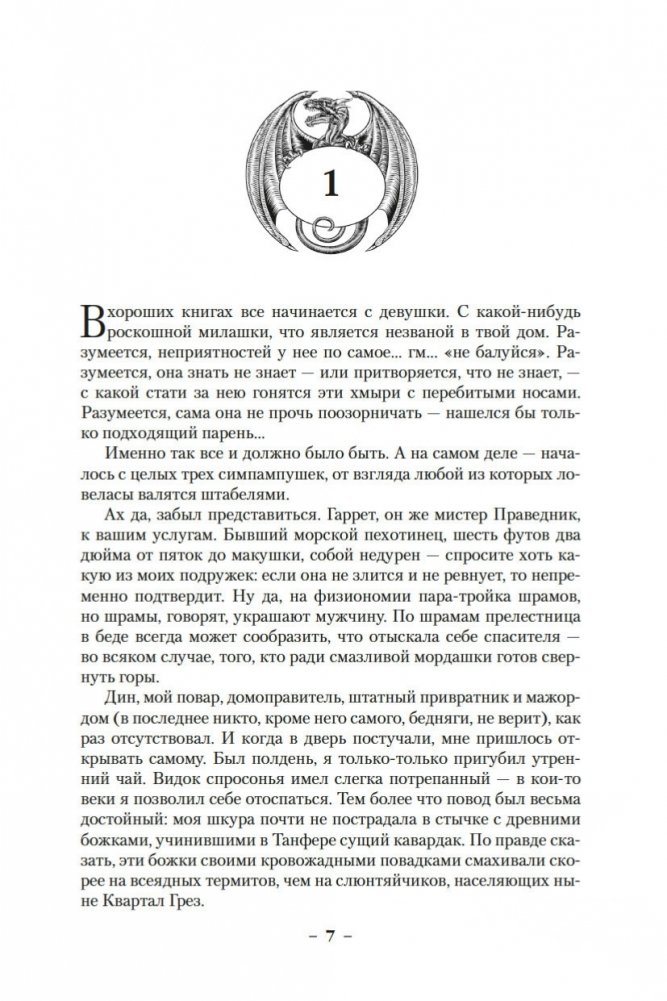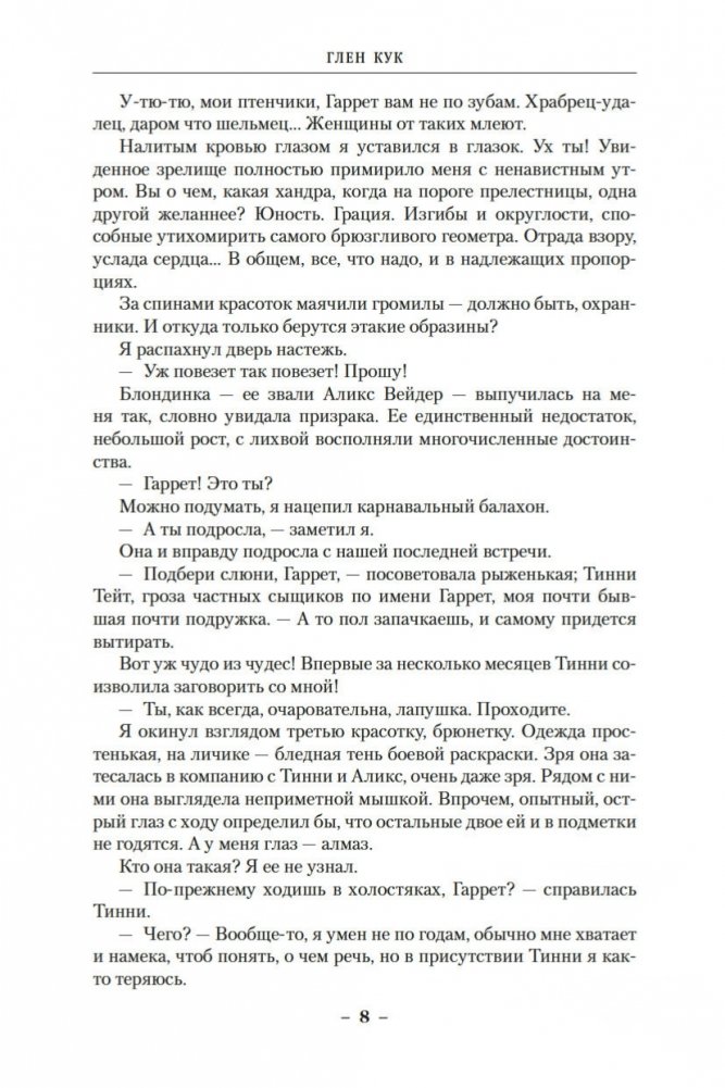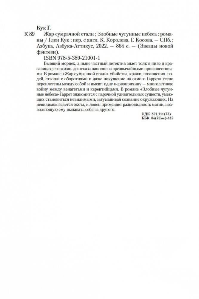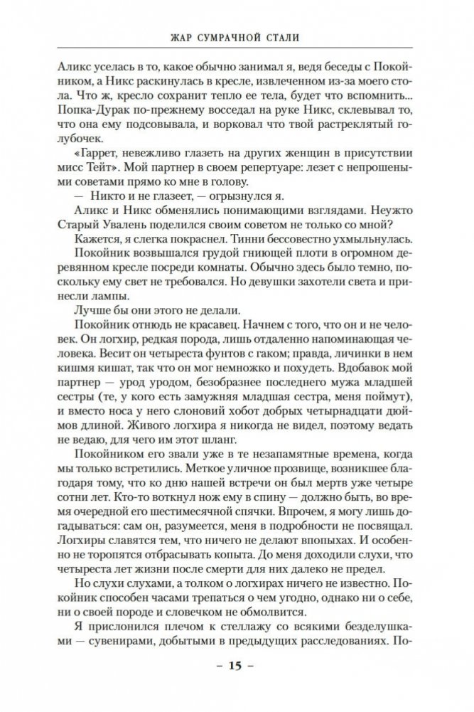 Бывший морпех, а ныне частный детектив знает толк в пиве и красавицах; его жизнь до отказа наполнена чрезвычайными происшествиями. В романе «Жар сумрачной стали» убийства, кражи, похищения людей, стычки с оборотнями и даже покушение на самого Гаррета тесно переплетены между собой и имеют одну первопричину — многолетнюю войну между венагетами и карентийцами. В романе «Злобные чугунные небеса» Гаррет знакомится с парочкой удивительных существ, умеющих становиться невидимыми, затуманивая сознание окружающих. На невидимок ведется охота, и ловец применяет разновидность магии, позволяющую ему выдавать себя за другого.