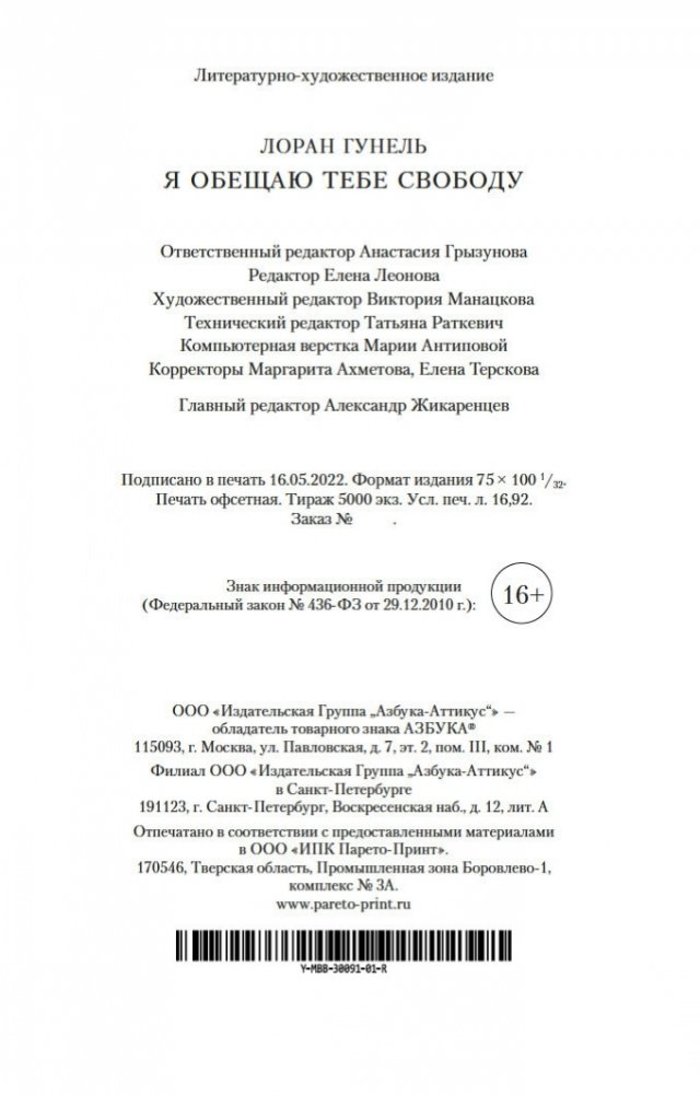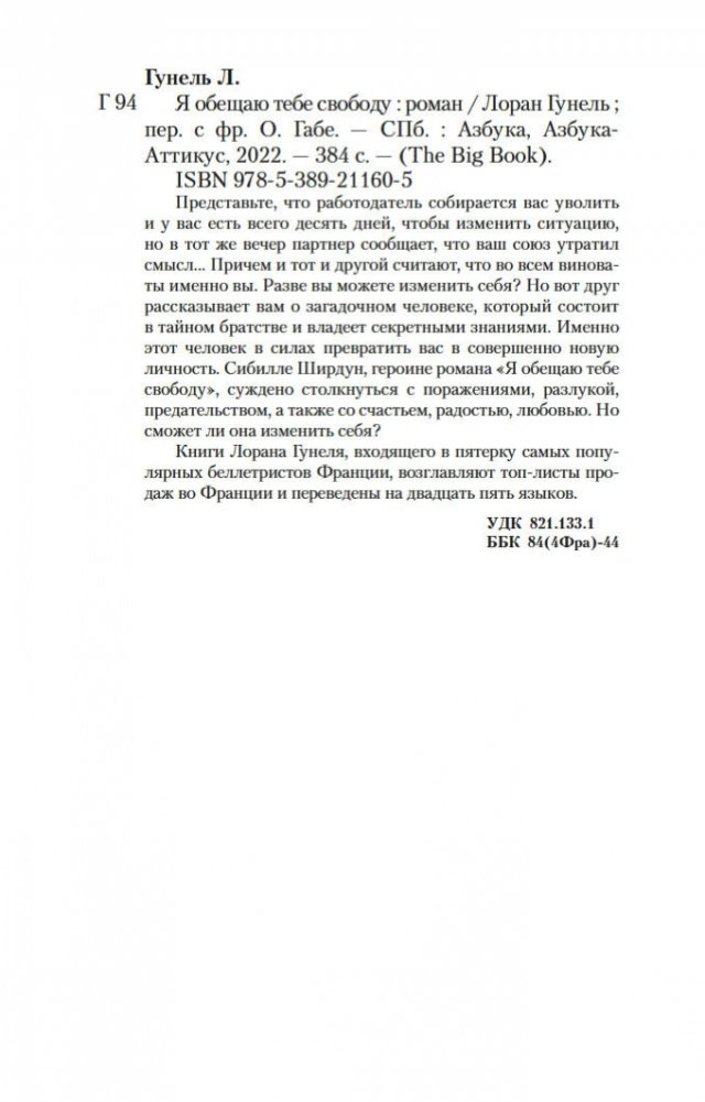 Представьте, что работодатель собирается вас уволить и у вас есть всего десять дней, чтобы изменить ситуацию, но в тот же вечер партнер сообщает, что ваш союз утратил смысл... Причем и тот и другой считают, что во всем виноваты именно вы. Разве вы можете изменить себя? Но вот друг рассказывает вам о загадочном человеке, который состоит в тайном братстве и владеет секретными знаниями. Именно этот человек в силах превратить вас в совершенно новую личность. Сибилле Ширдун, героине романа «Я обещаю тебе свободу», суждено столкнуться с поражениями, разлукой, предательством, а также со счастьем, радостью, любовью. Но сможет ли она изменить себя? Книги Лорана Гунеля, входящего в пятерку самых популярных беллетристов Франции, возглавляют топ-листы продаж во Франции и переведены на двадцать пять языков.