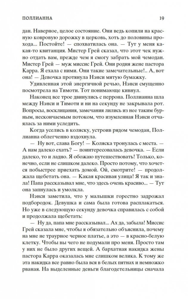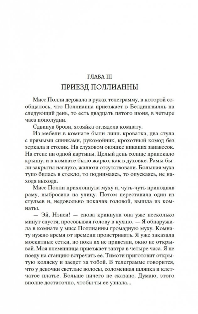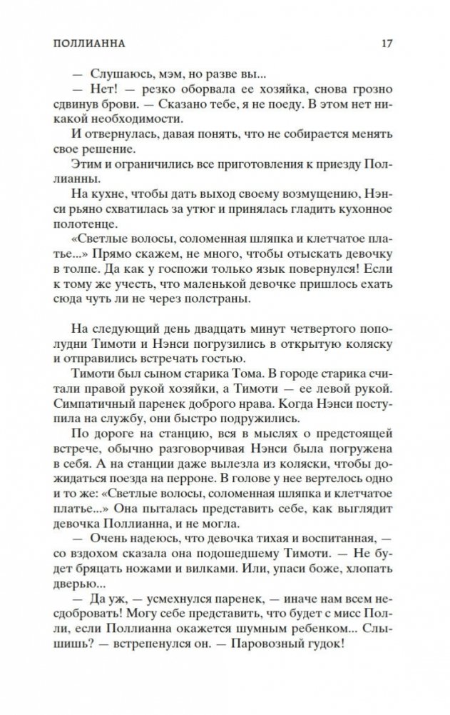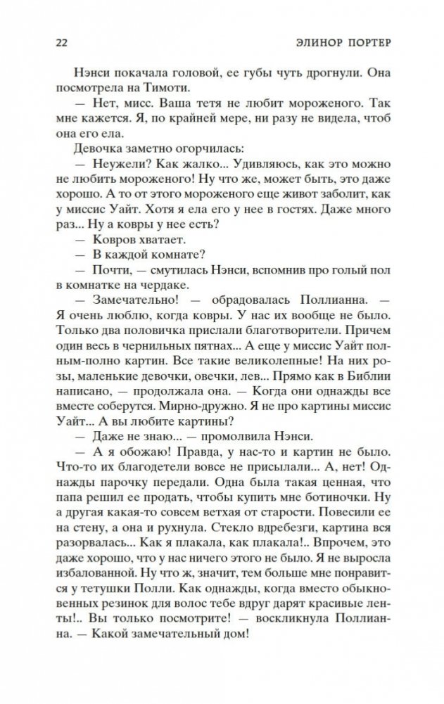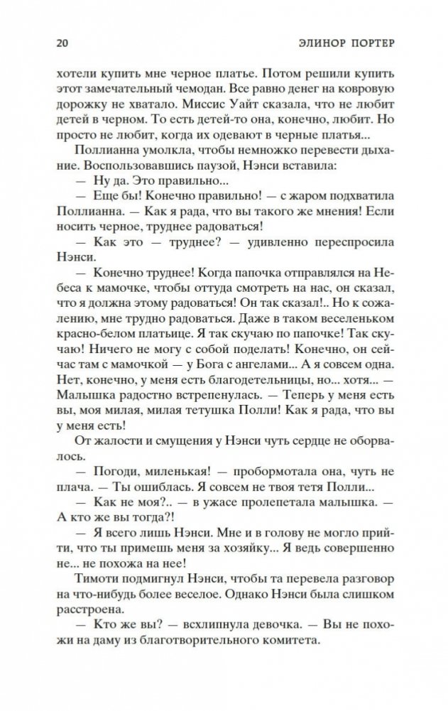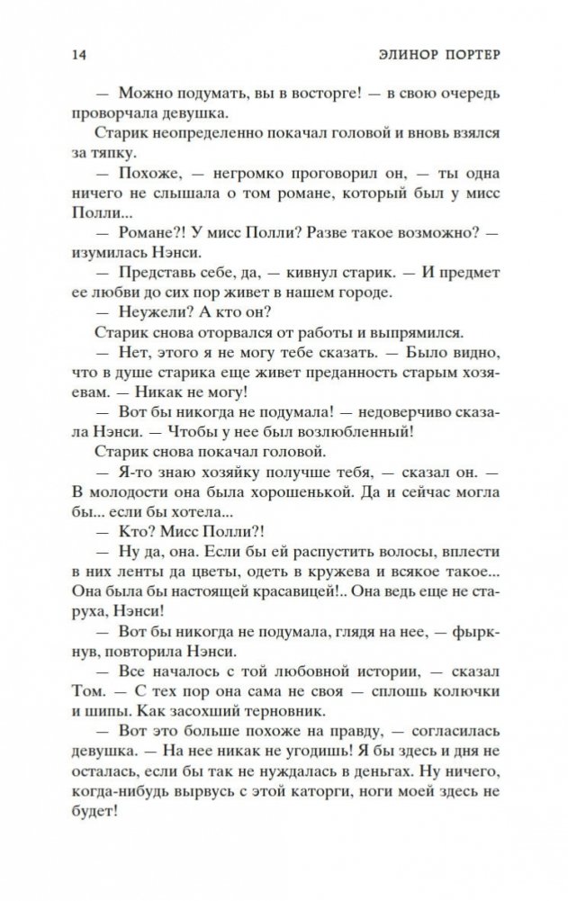 Роман Элинор Портер «Поллианна» рассказывает о печалях и радостях маленькой девочки, которая после смерти папы вынуждена переехать к сварливой тетке, в мир строгих правил и запретов. К счастью, Поллианна успела научиться у папы замечательному умению: не унывать при любых обстоятельствах и даже в самых тяжелых ситуациях находить выход из положения. Впервые изданная в 1913 году, книга стала настоящим бестселлером, была переведена на многие языки и неоднократно экранизировалась. В 1915 году Элинор Портер написала продолжение истории — «Поллианна выросла». Ее героиня повзрослела, но не утратила своего детского восхищения миром. Поллианна по-прежнему считает, что все трудности преодолимы, главное — верить!