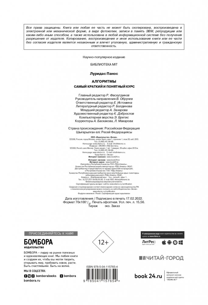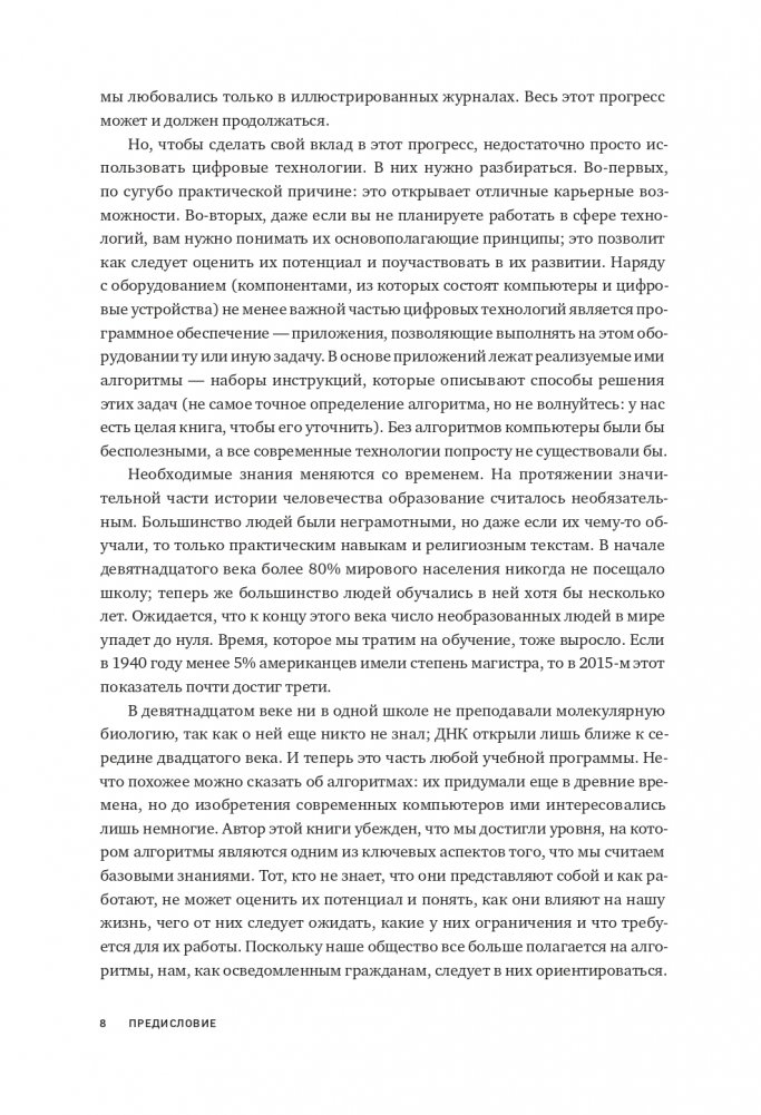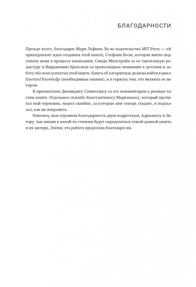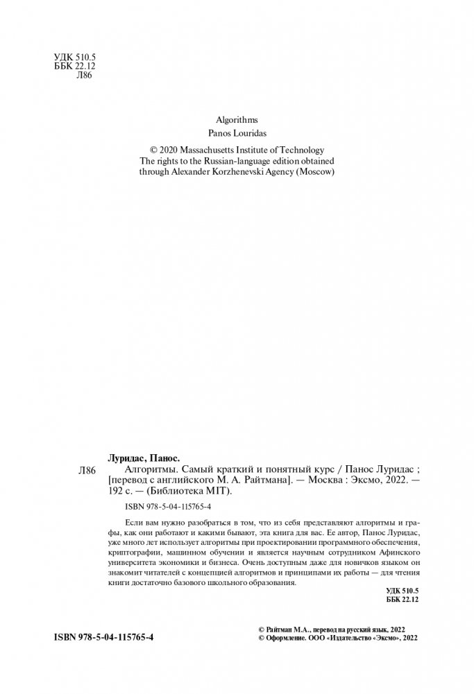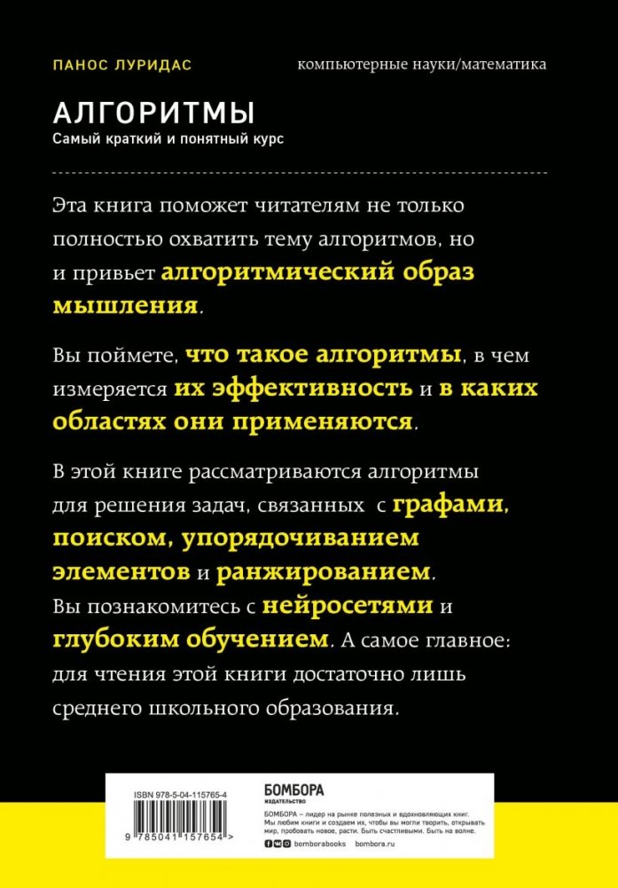 Вам требуется понять, что такое алгоритмы и графы, как они работают и изучить их? Эта книга для вас. Для ее чтения требуется лишь базовое школьное образование — здесь вы найдете все ответы на вопросы по этой теме, а также краткие и понятные объяснения даже сложных понятий и чуть-чуть математики. Автор, Панос Луридас, много лет занимается изучением и практическим применением алгоритмов в проектах, связанных с разработкой программного обеспечения, криптографией и машинным обучением, — он знает об алгоритмах буквально всё и заражает читателей своим энтузиазмом и интересом к этой теме с первых строк.
