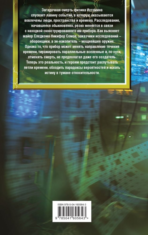 Загадочная смерть физика Истомина спускает лавину событий, в которую оказываются вовлечены люди, пространства и времена. Расследование, начавшееся обыкновенно, резко меняется в связи с находкой сконструированного им прибора. Как выясняет майор Следкома Никифор Сомов, заказчики исследований – оборонщики, а эн-накопитель – мощнейшее оружие. Однако то, что прибор может менять направление течения времени, тиражировать параллельные вселенные и по сути отменять смерть, не предполагал даже его создатель. Теперь это реальность, и героям предстоит распутывать петли времени, обходить парадоксы вероятностей и искать истину в тумане относительности.