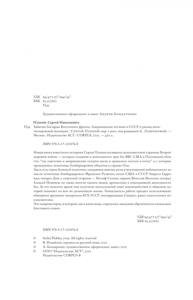 Новая книга известного историка Сергея Плохия посвящена малоизвестной странице Второй мировой войны — истории создания и деятельности трех баз ВВС США в Полтавской области, “где советские и американские солдаты жили и сражались плечом к плечу” и с которых проводились челночные бомбардировки объектов в странах Оси. Здесь есть герои большой политики, сыгравшие важные роли в воплощении амбициозного замысла челночных бомбардировок: Франклин Рузвельт, посол США в СССР Аверелл Гарриман, генерал Дин, с советской стороны — Иосиф Сталин, нарком Вячеслав Молотов, генерал Алексей Новиков, но также многие тысячи людей, причастных к повседневной деятельности баз. За это недолгое время они получили колоссальный опыт взаимодействия и общения, который повлияет на всю их дальнейшую жизнь. Уникальность работе придает использование обширных архивных материалов КГБ УССР (контрразведки Смерш), ранее недоступных исследователям. Это микроистория, в которой, как в капле воды, отразилась заведомая обреченность изначально блестящего плана.