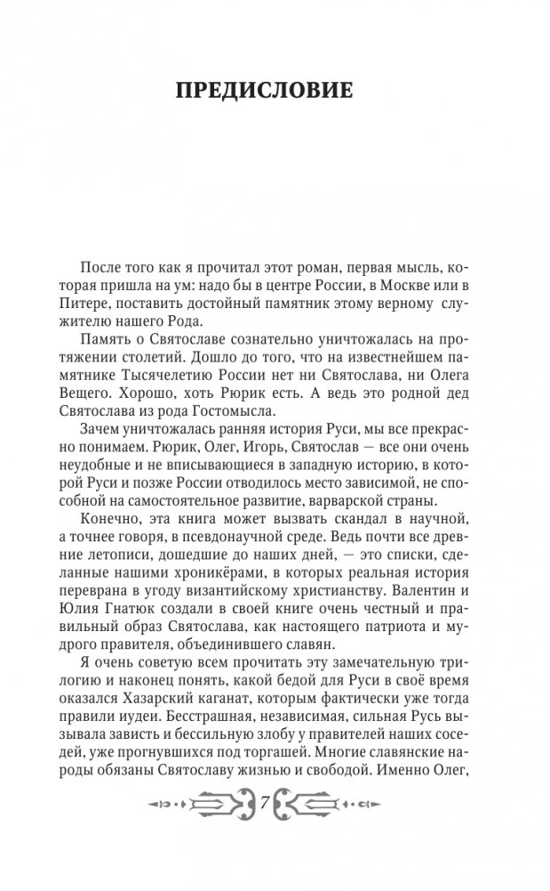 Книга читается на одном дыхании: правление княгини Ольги, подробности ведического обучения, любви и ратного возмужания Святослава, романтические эпизоды и захватывающие батальные сцены доставят читателям истинное удовольствие. Совершите неповторимое волшебное путешествие в глубины генетической памяти русского народа!