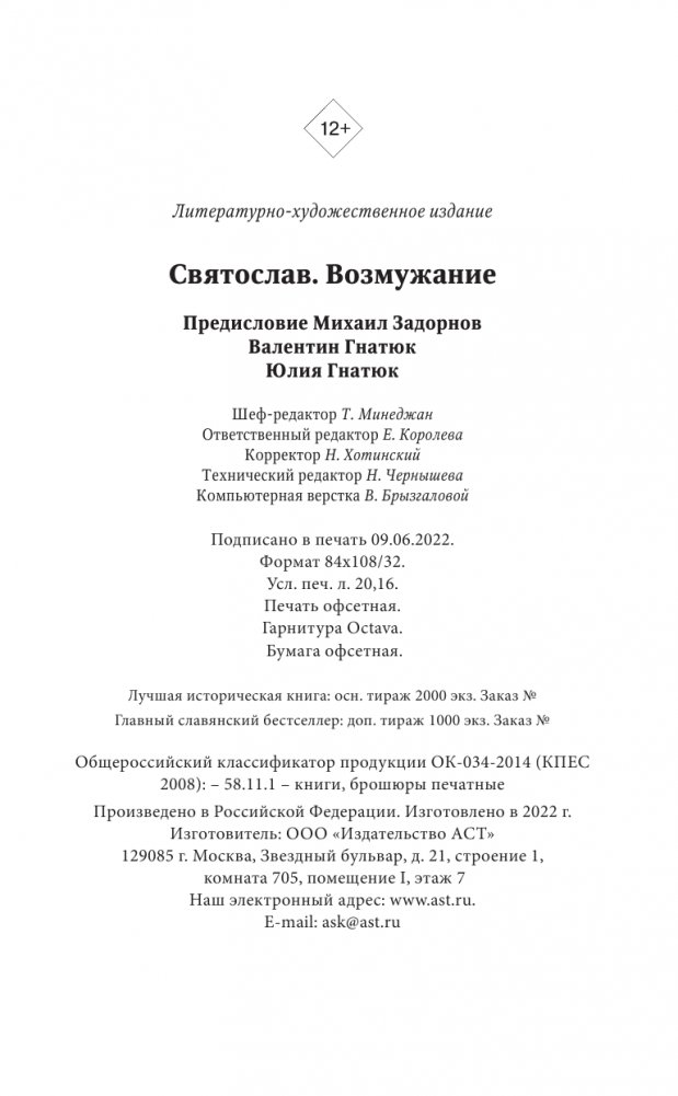 Валентин и Юлия Гнатюк, авторы ряда книг на древнеславянскую тематику, среди которых замечательная трилогия о его внуке князе Святославе Хоробром. Увлекательная правдивая история о князе Cвятославе читается на одном дыхании. В основу положены многие исторические данные, переосмысленные и воспроизведённые авторами с такой бережностью и глубиной, что даёт все основания назвать данное произведение романом-реконструкцией.Факты, описанные в книге, в школьной программе не упоминаются. Интересна для углубленного понимания истории славян.