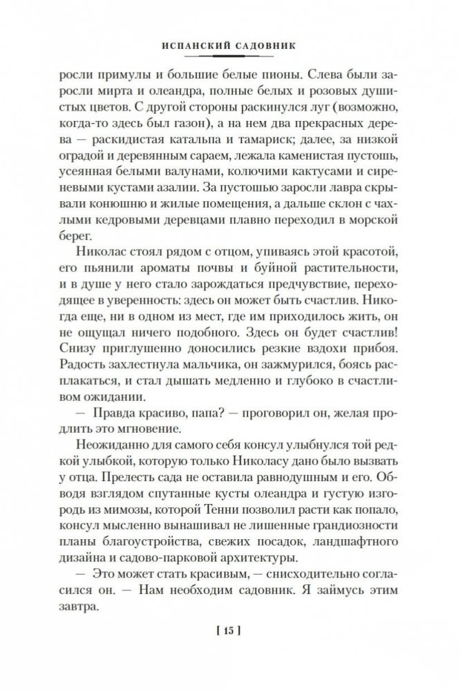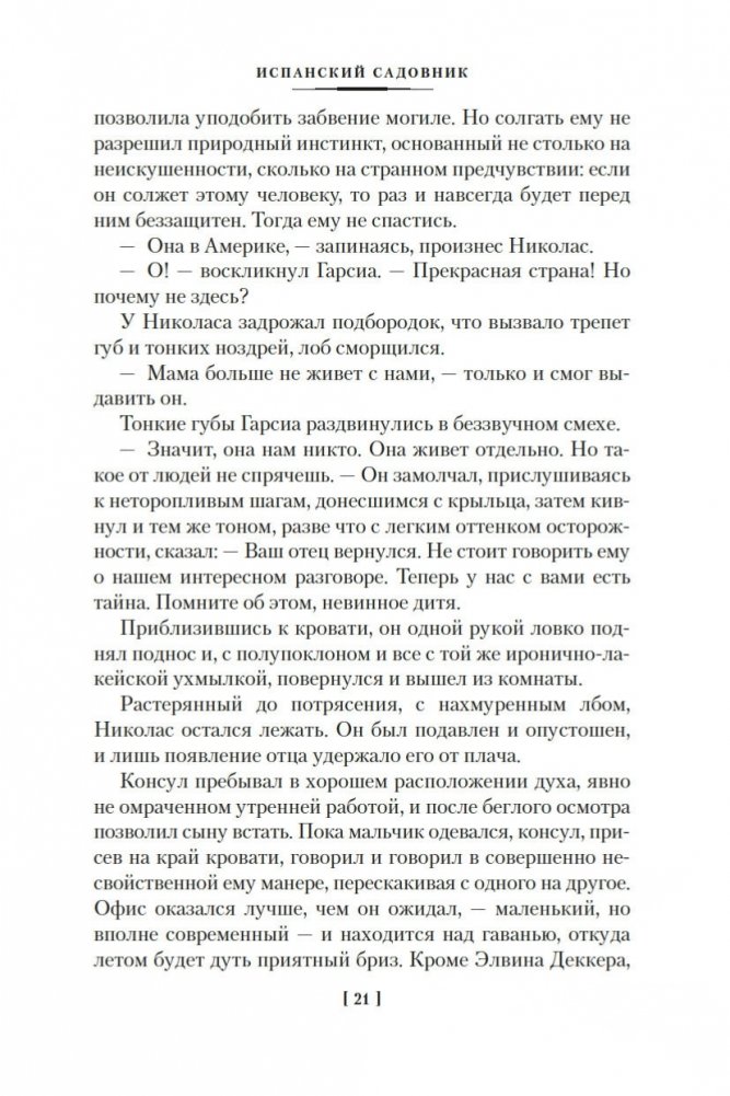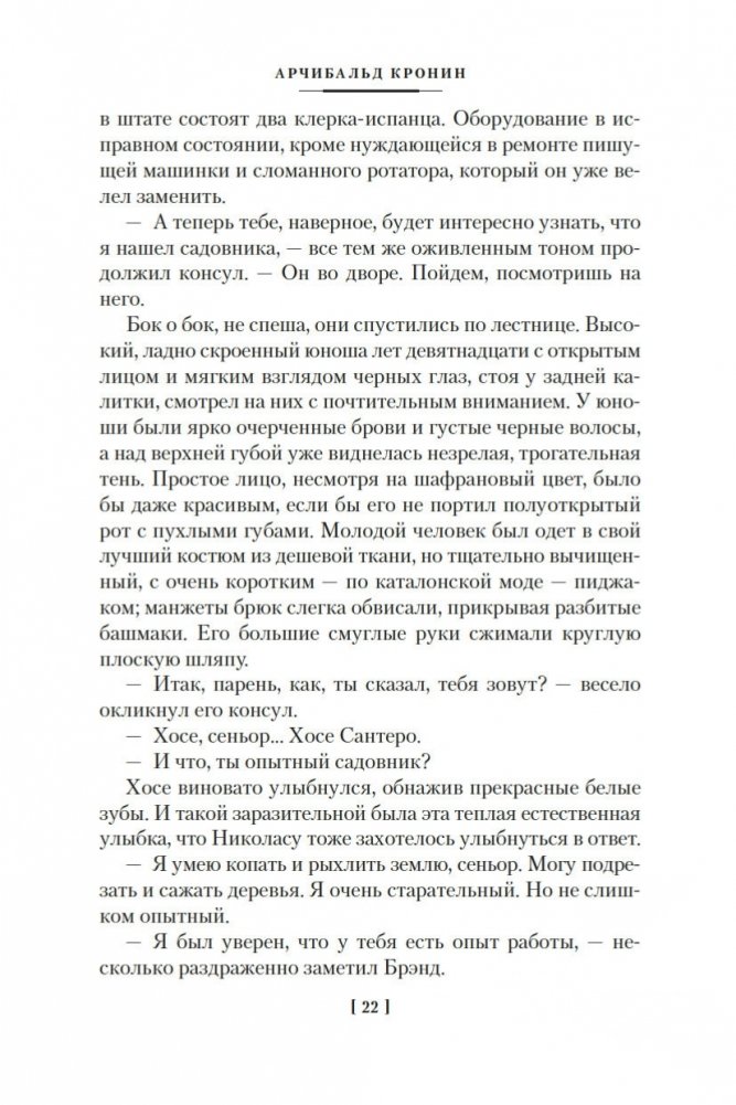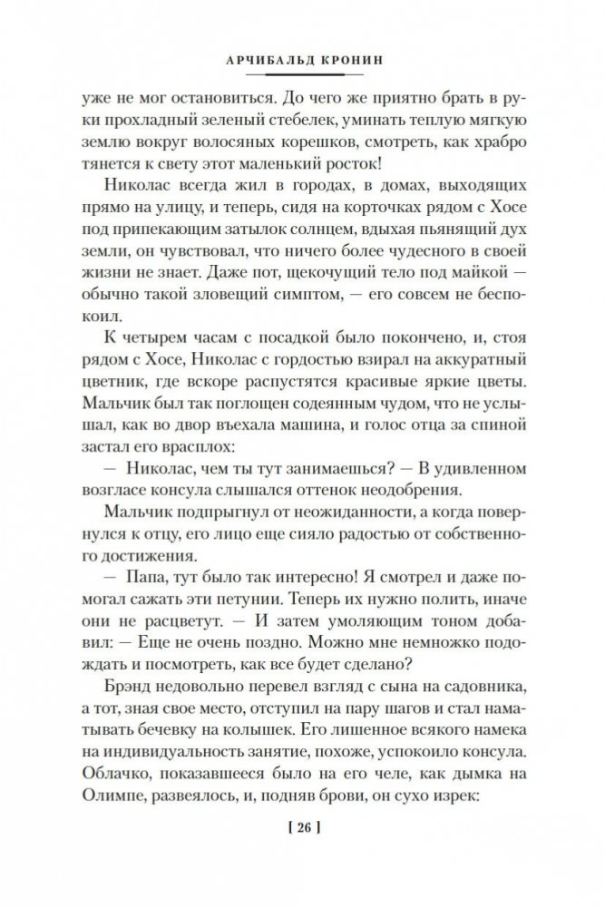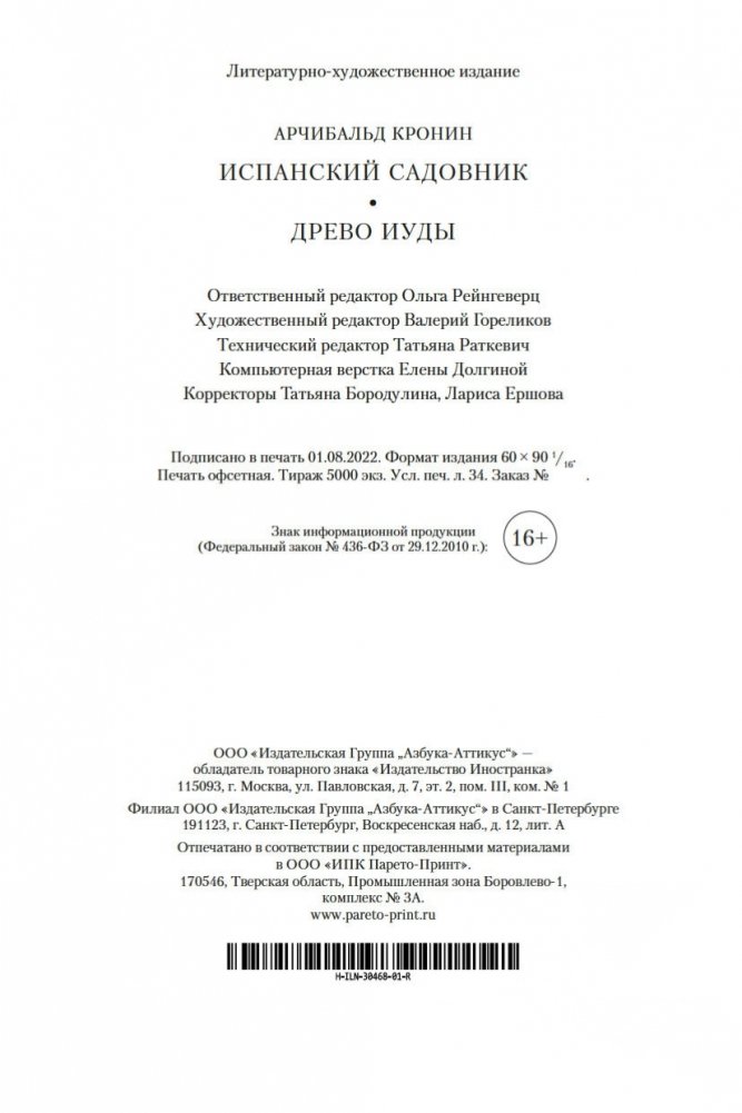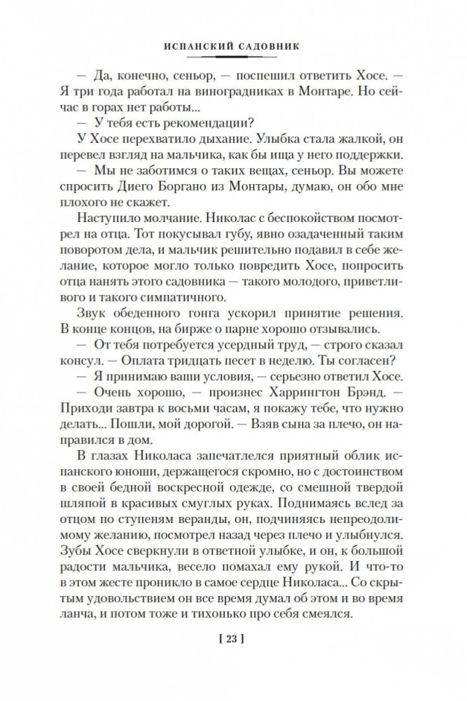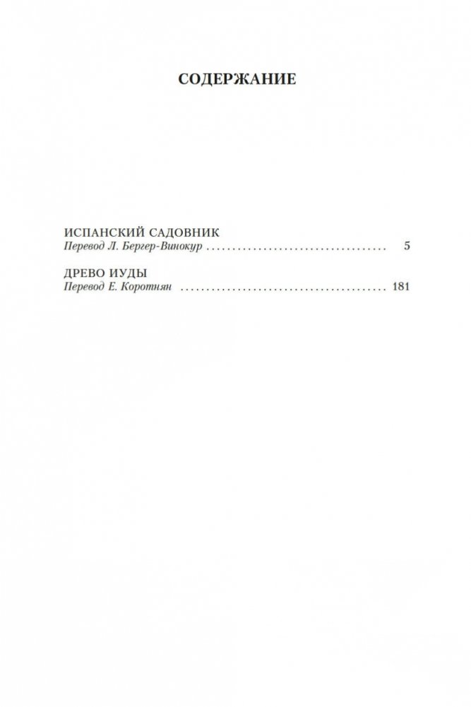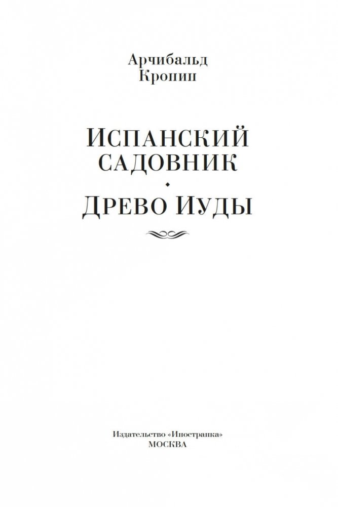 У консула Харрингтона Брэнда не сложились ни личная жизнь, ни карьера. Получив незначительный пост в маленьком испанском городке, он переезжает туда вместе с сыном Николасом. Эгоистичный и властный отец не разрешает мальчику видеться с матерью, под предлогом слабого здоровья не пускает его в школу и не позволяет общаться со сверстниками. И потому Николас быстро заводит дружбу с молодым дружелюбным садовником Хосе. Чувствуя, что сын выходит из-под его жесткого контроля, обозленный Харрингтон Брэнд идет на сомнительные меры, чтобы разорвать дружбу Николаса и Хосе… Дэвид Мори, шотландский врач, живет в Швейцарии и пользуется уважением в обществе. Его считают баловнем судьбы. Однако уже много лет Мори страдает бессонницей, его преследуют воспоминания о женщине, которую он когда-то любил, но бросил. Не в силах исправить ошибки молодости, он снова и снова разрушает себя, ломает судьбы дорогих ему женщин и приближает неминуемую трагедию… Романы «Испанский садовник» (впервые на русском!) и «Древо Иуды» написаны в прекрасной повествовательной манере классических произведений Кронина.