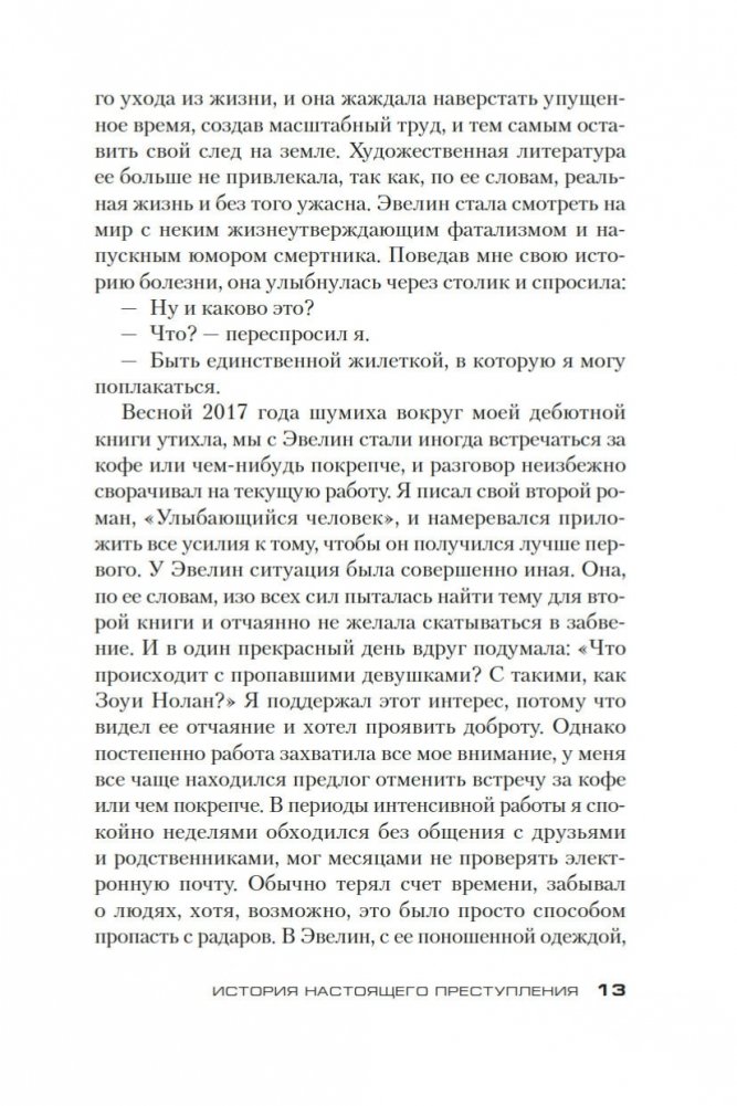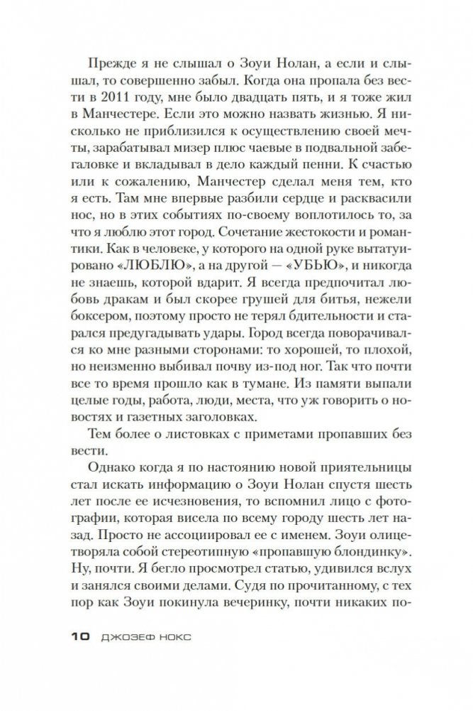 «Что происходит с пропавшими девушками? С такими, как Зоуи Нолан?» Ночью 17 декабря 2011 года девятнадцатилетняя студентка Манчестерского университета Зоуи Нолан вышла с вечеринки в общежитии — и пропала. Длительные полицейские поиски не дали никаких результатов. Через семь лет писательница Эвелин Митчелл решает провести свое расследование и заново опрашивает друзей и родственников Зоуи. В чем-то их истории сходятся, в чем-то — противоречат друг другу, рисуя тревожную картину тайной жизни пропавшей девушки. Всем фигурантам дела есть что скрывать, а кто-то неотступно следит за Эвелин из теней — и она обращается за помощью к «главной надежде британского криминального романа» (по утверждению газеты «Таймс») Джозефу Ноксу, автору прославленной трилогии об Эйдане Уэйтсе («Сирены», «Улыбающийся человек», «Блуждающий в темноте»)… Впервые на русском!