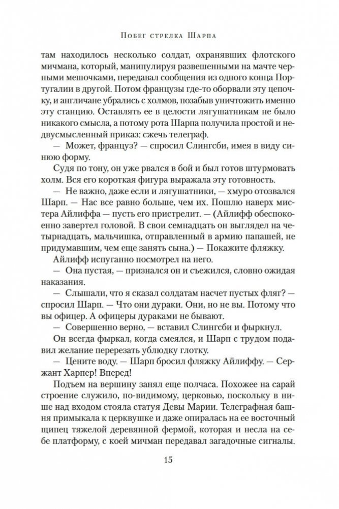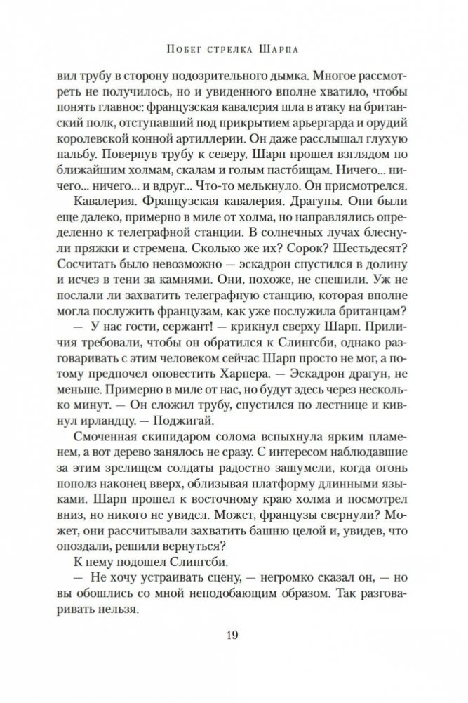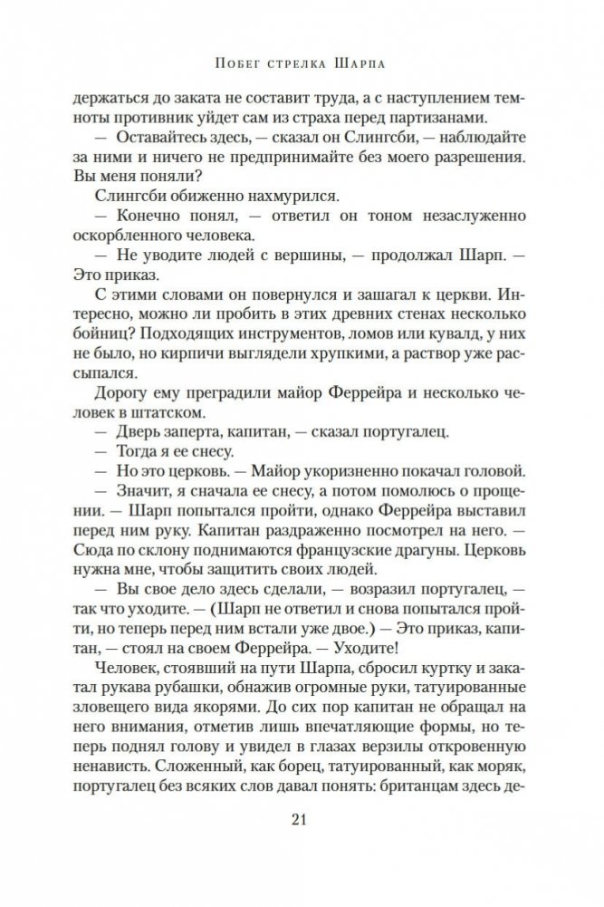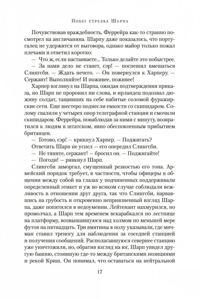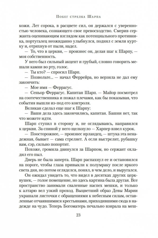 В начале девятнадцатого столетия Британская империя простиралась от пролива Ла-Манш до Индийского океана. Одним из строителей этой империи, участником всех войн, которые вела в ту пору Англия, был стрелок Шарп. В романе «Побег стрелка Шарпа» только от героя зависит, захватит ли победоносная армия Наполеона Португалию. Жизнь Шарпа постоянно висит на волоске, опасность подстерегает его со всех сторон. Шарпу придется противостоять завистливым и некомпетентным вышестоящим офицерам, мнимым союзникам, готовым предать в любую минуту, и коварному неприятелю. В романе «Ярость стрелка Шарпа» английская армия стоит на пороге поражения. Испания попала под власть французов. Остался непокоренным только Кадис, за стенами которого идет хитроумная дипломатическая игра. Единственная надежда британцев — Шарп и его однополчане, не желающие признать свое поражение.
