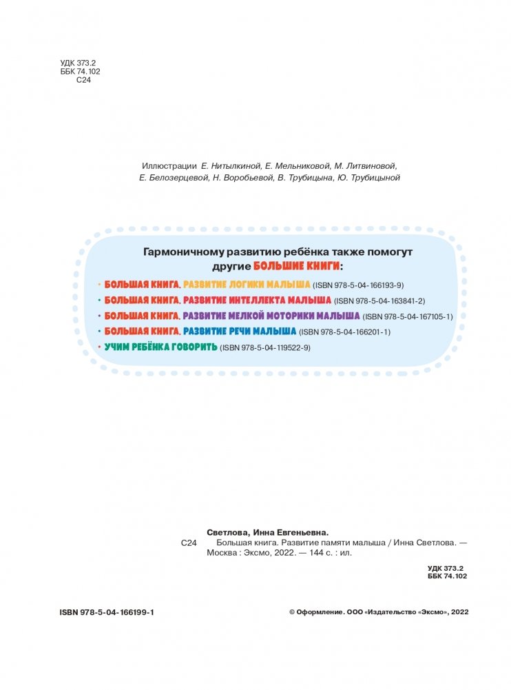«Большая книга. Развитие памяти малыша» — это отличный помощник для родителей, которые хотят своевременно и качественно заняться подготовкой своего малыша к занятиям в школе. К началу учёбы ребёнку необходимы такие навыки, как усидчивость и готовность запоминать большое количество новой информации.
