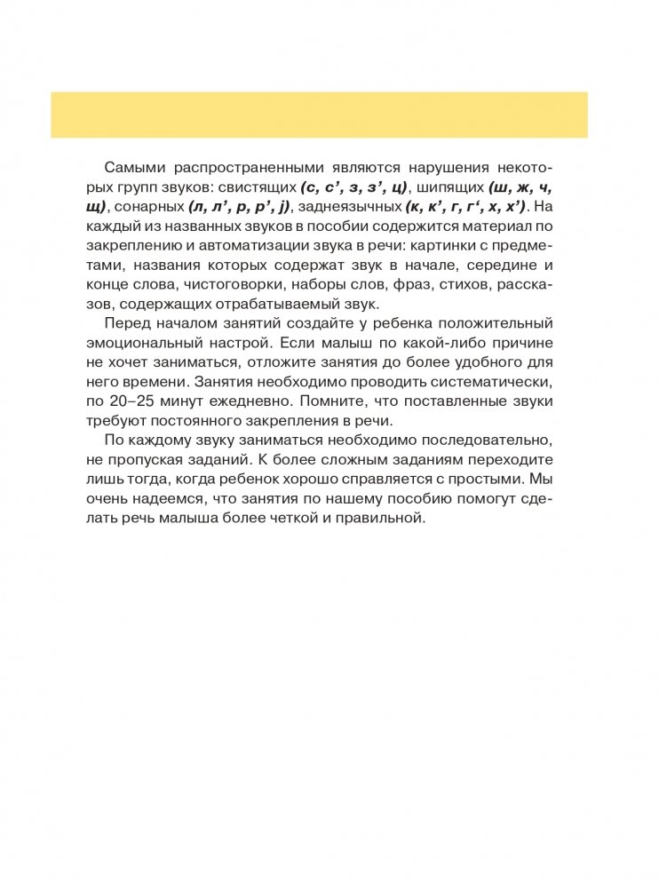 И в подобных занятиях вам обязательно пригодится это пособие. Автор книги — Инна Светлова, известный и опытный педагог. Этот сборник упражнений специально разработан ей для самостоятельных занятий родителей со своими детьми. Особое внимание в книге уделяется последовательной проработке и автоматизации правильного произношения звуков от простых к сложным. Это позволит вашему ребёнку научиться чётко и грамотно произносить все звуки и, как следствие, — правильно говорить.